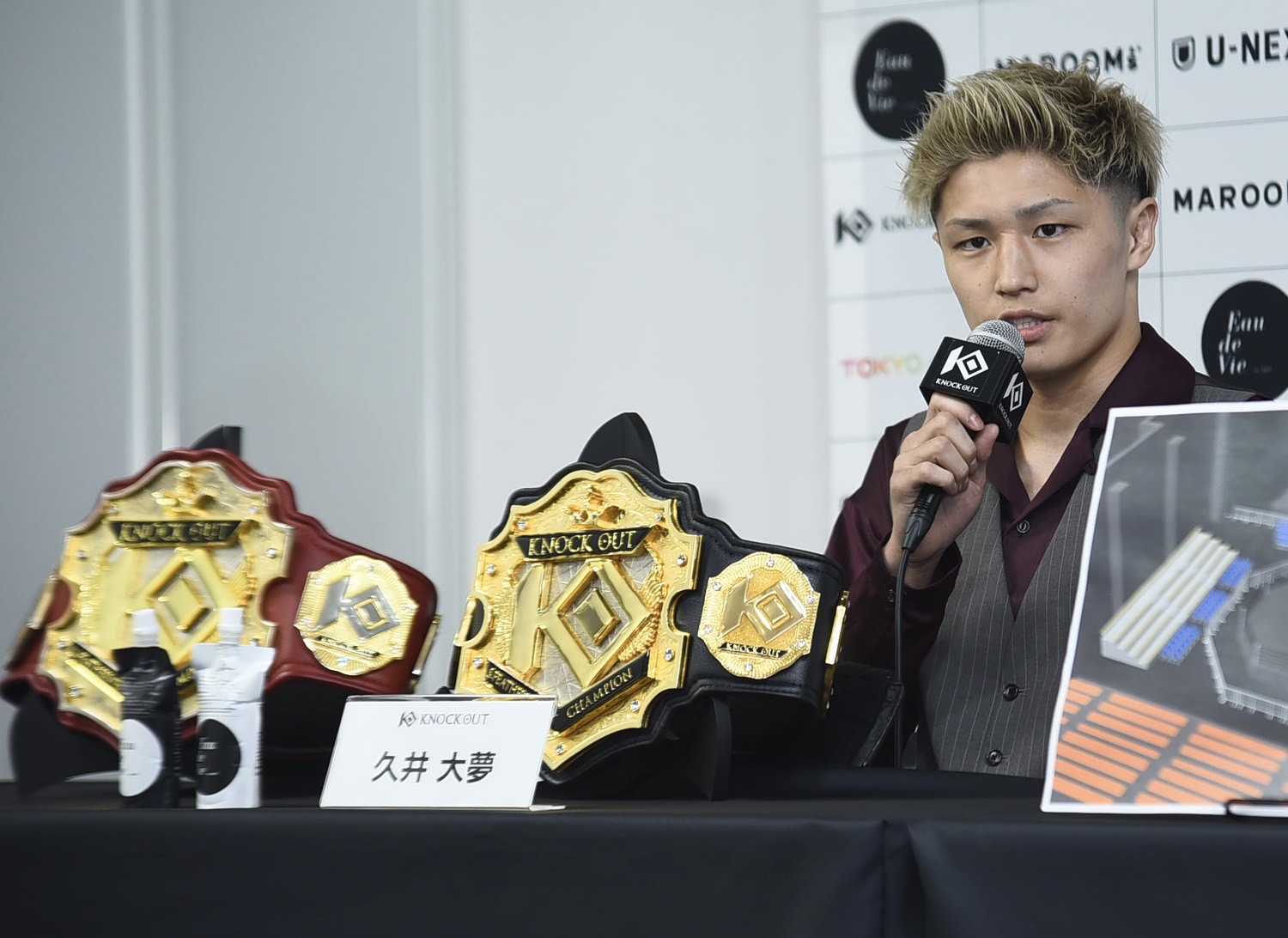 会見冒頭で久井は、ライト級に階級変更するために保持しているKNOCK OUT BLACK&REDのスーパーフェザー級の2本のベルトを返上。
