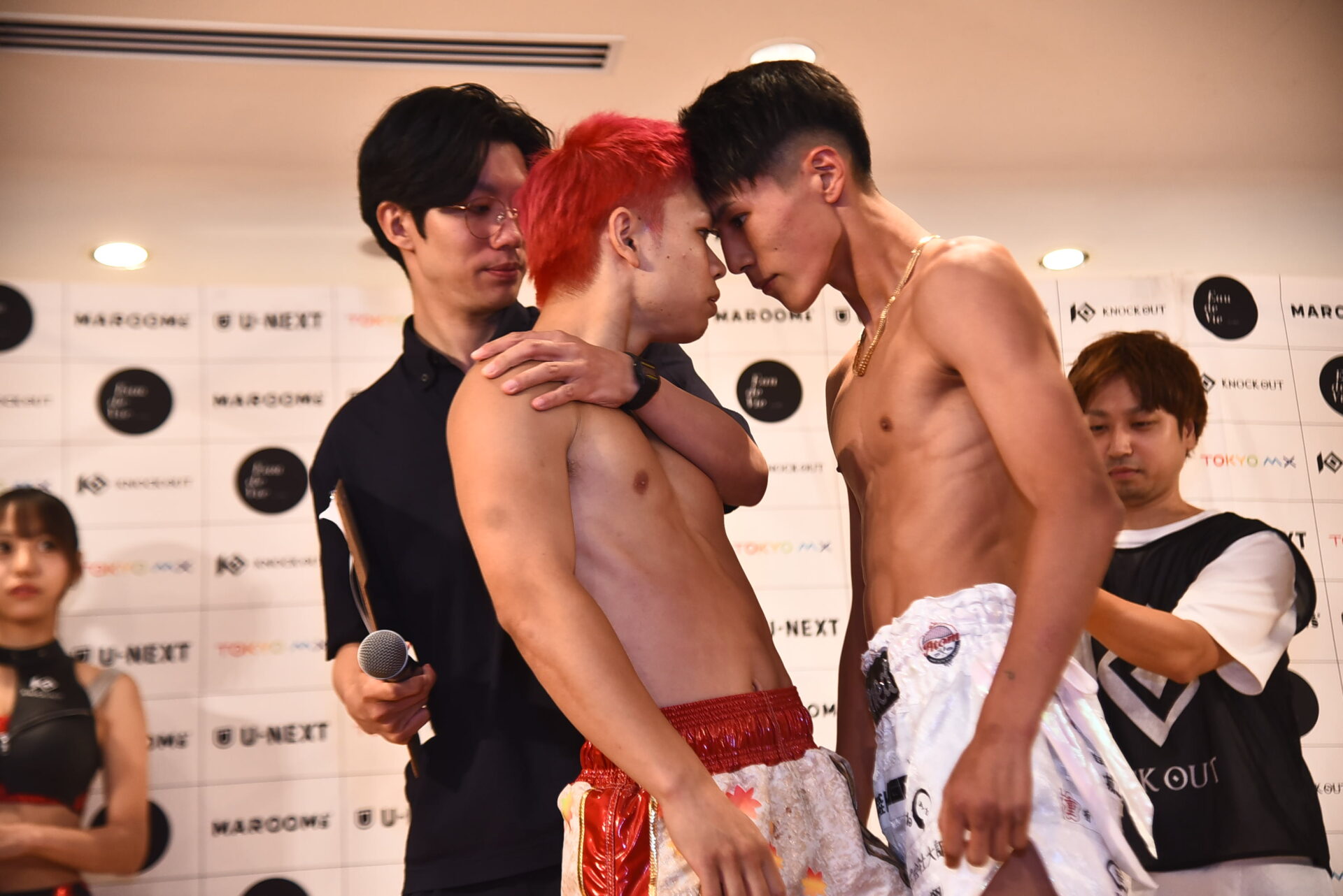 祐輝(OU-BU GYM)→57.40kg 「対戦相手の勇成選手は勢いがあって9連勝とチャンピオンらしいチャンピオンかなと思うので、しっかり自分が返り討ちしたいと思うので応援お願いします。 (どういう形で勝ちたいか)REDルールのオープンフィンガーということで、結構打ち合いは激しくなるのかなと思うんですけど、最後は打ち合って自分がKOしたいと思います。 (フェイスオフで感じたこと)自分がKOで勝つと思っています。2週間後にUNLIMITEDルールの試合を控えてますけど、それも承知で受けてるのは皆さんわかっていると思うので、ここはしっかり倒します。勇成選手はフェイスオフの時も勢いがあって、いい選手だなと思いました。ちょっと気持ちが乗っている分、もうちょっとチャンピオンとしての器を持ってもらって、自分を倒すなら、しっかり結果で示してもらいたいですね。それも俺は全力でやり返したいと思うので、よろしくお願いします。 (髪を赤く染めた理由)子供が鬼滅の刃が好きで、鬼滅の刃の中でも猗窩座(あかざ)が好きなんです。後から知ったんですけど、相手の勇成選手の名前は冨岡と聞いたので、今回の映画が猗窩座対冨岡(義勇)ということで。でも炭治郎はいないので一人だと多分負けちゃうのかなと思ってますね。 (試合への思い)ちょっと悲しい話はしたくないんですけど、自分は子供が4人いて、その中で会社員としてもみじまんじゅうという大手の会社に勤めさせてもらって、お菓子を作りながら格闘技もやってるんですけど、それとは別件で、俺のお母さんが去年夏ぐらいに認知症になっちゃって。ちょっと引退しようかなと思ったんですよ。去年にKNOCK OUTに出てちょっと負けてしまって、そこから3連敗して。他団体のベルトを勇成君みたいに獲って、もう一回KNOCK OUTに戻ってこようと思ったんですけど、たまたま代々木の大会に呼んでもらって、しっかりKOで勝てました。お母さんが記憶がなくなってしまうのは俺個人的に結構ショックで、認知症の薬の費用がかかるんです。親孝行できるのは俺が強くなって有名になって、お母さんの医療費とか稼いでいったり、記憶があるうちにしっかりベルトを獲って、どうしても記憶があるうちに有名になりたいんです。だから、絶対に負けられないです」