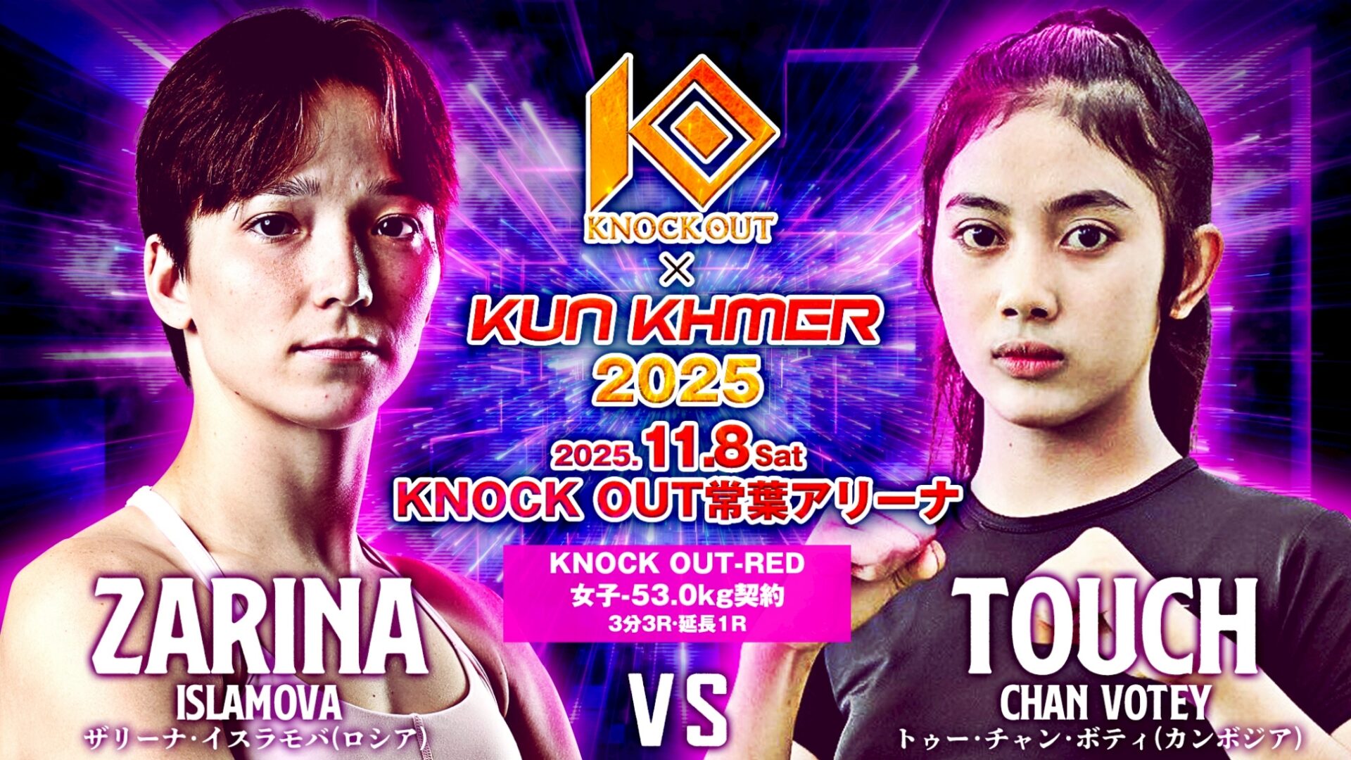 中堅戦には、「一度でも出たらKNOCK OUTファイター。クンクメールに一度も勝ち越したことがないので、ちょっと勝ちたいと思って」抜擢されたザリーナが出場し、対戦するトゥー・チャン・ボティ(カンボジア)は160㎝、31戦28勝(7KO)3敗の戦績を持つ20歳で、今年4月に鈴木万李弥とカンボジアで対戦して判定勝ちしている。
