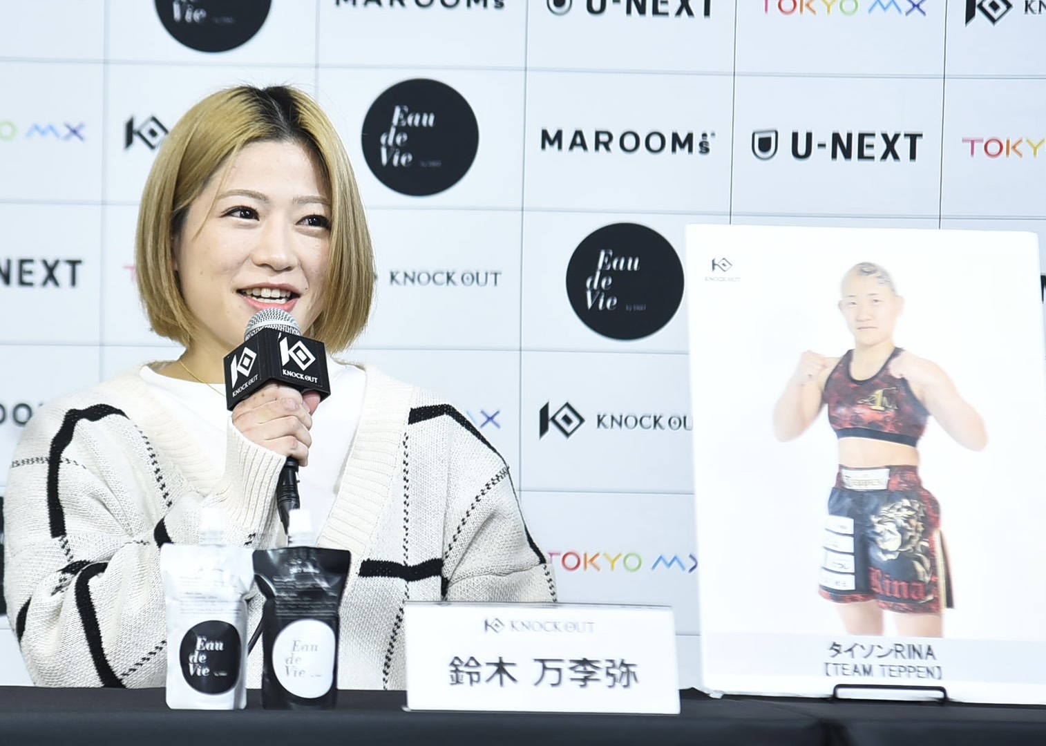 「今回女子初のUNLIMITEDの試合ということで、注目度が高くなってきてると思うんですけど、ここは怖がらず、打ち合いに持っていって、年末のようなKNOCK OUTの盛り上がる試合を女子で見せたいと思うので、頑張ります。