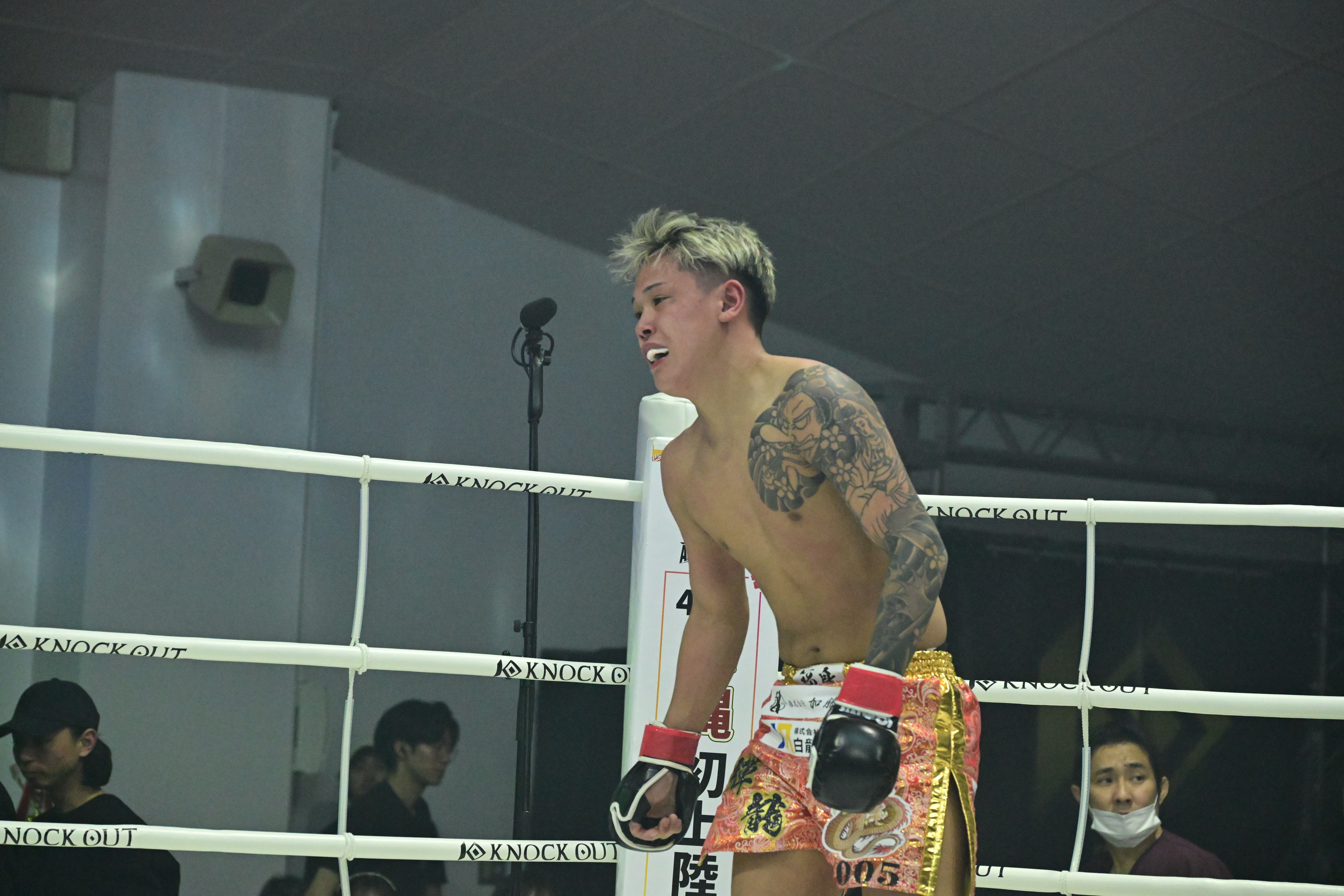 ――[UNLIMITED最強ジムはどこだ!ジム対抗3vs3トーナメント]準決勝のKNOCK OUT クロスポイント戦では下田蓮選手が3人抜きを達成。輝龍選手は決勝の和術慧舟會HEARTS戦からの登場となりました。試合はHEARTSの先鋒=岩田虎之助選手にTKO負けという残念な結果でした。