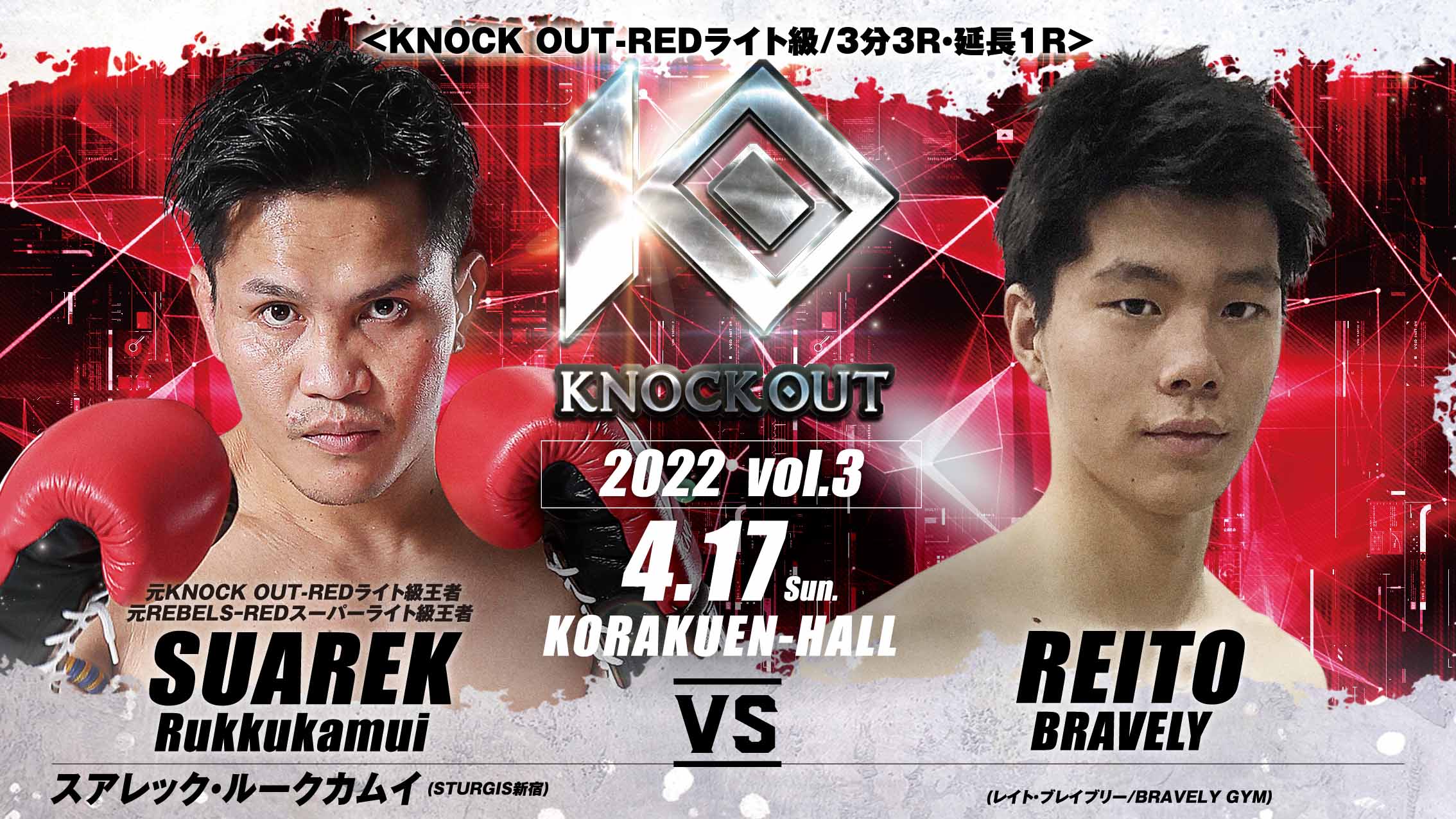 昨年12月、大分で開催された『KODO』でスアレックはNOBU BRAVELYにM-1世界スーパーライト級初代王座決定戦で勝利し、王座獲得。7月のKNOCK OUT-REDライト級タイトルマッチで重森陽太に敗れて以来の『KNOCK OUT』参戦となる。対するREITOは同大会でM-1 JAPAN ライト級初代王座を獲得している。