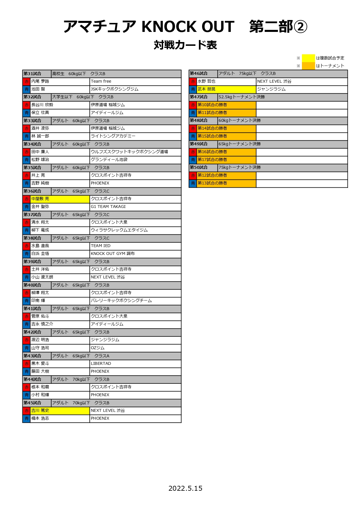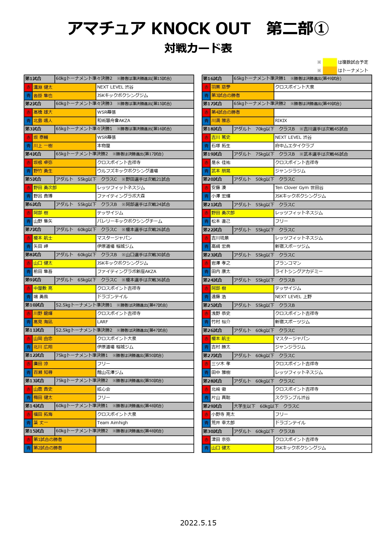 2022年5月15日(日)に新宿FACEで行われます「KNOCK OUTアマチュア」の対戦カードが決定いたしましたので、お知らせいたします。
