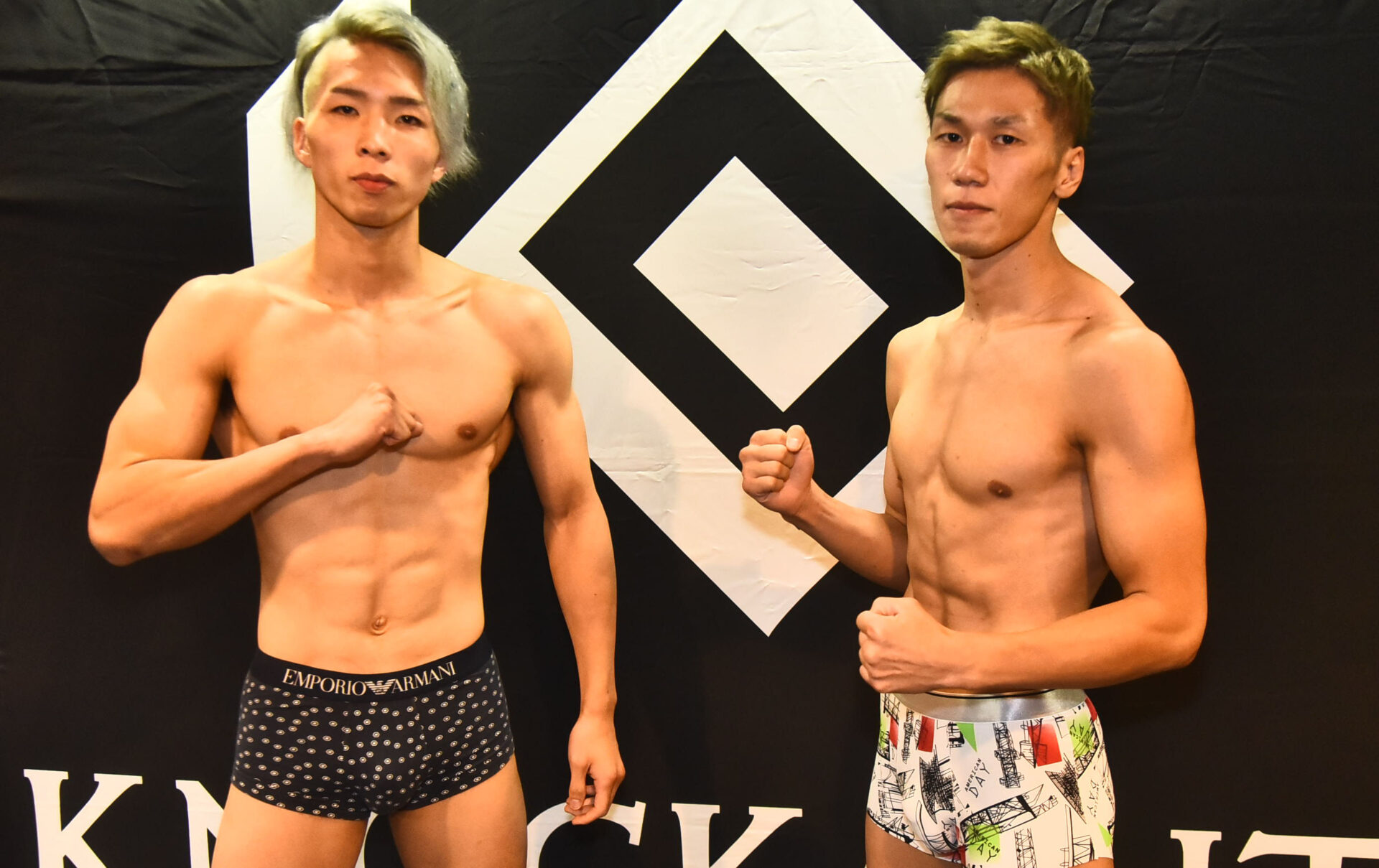 メインイベント(第6試合)のKNOCK OUT-REDスーパーフライ級(-52.0kg)で対戦する乙津陸(クロスポイント大泉)は51.8kg、谷津晴之(新興ムエタイジム)は51.65kgで計量を一発クリアーし、あとは試合のゴングを待つのみとなった。