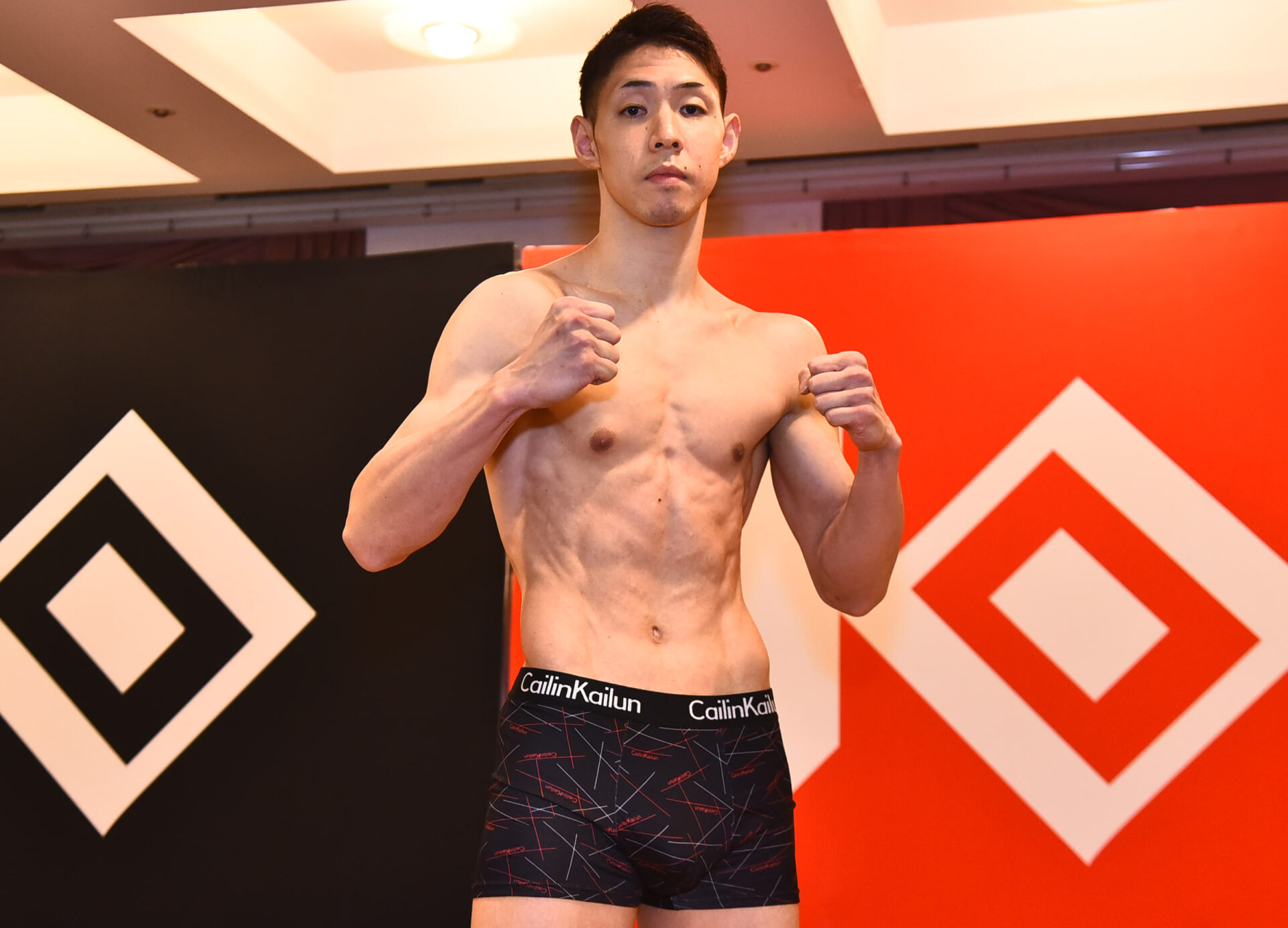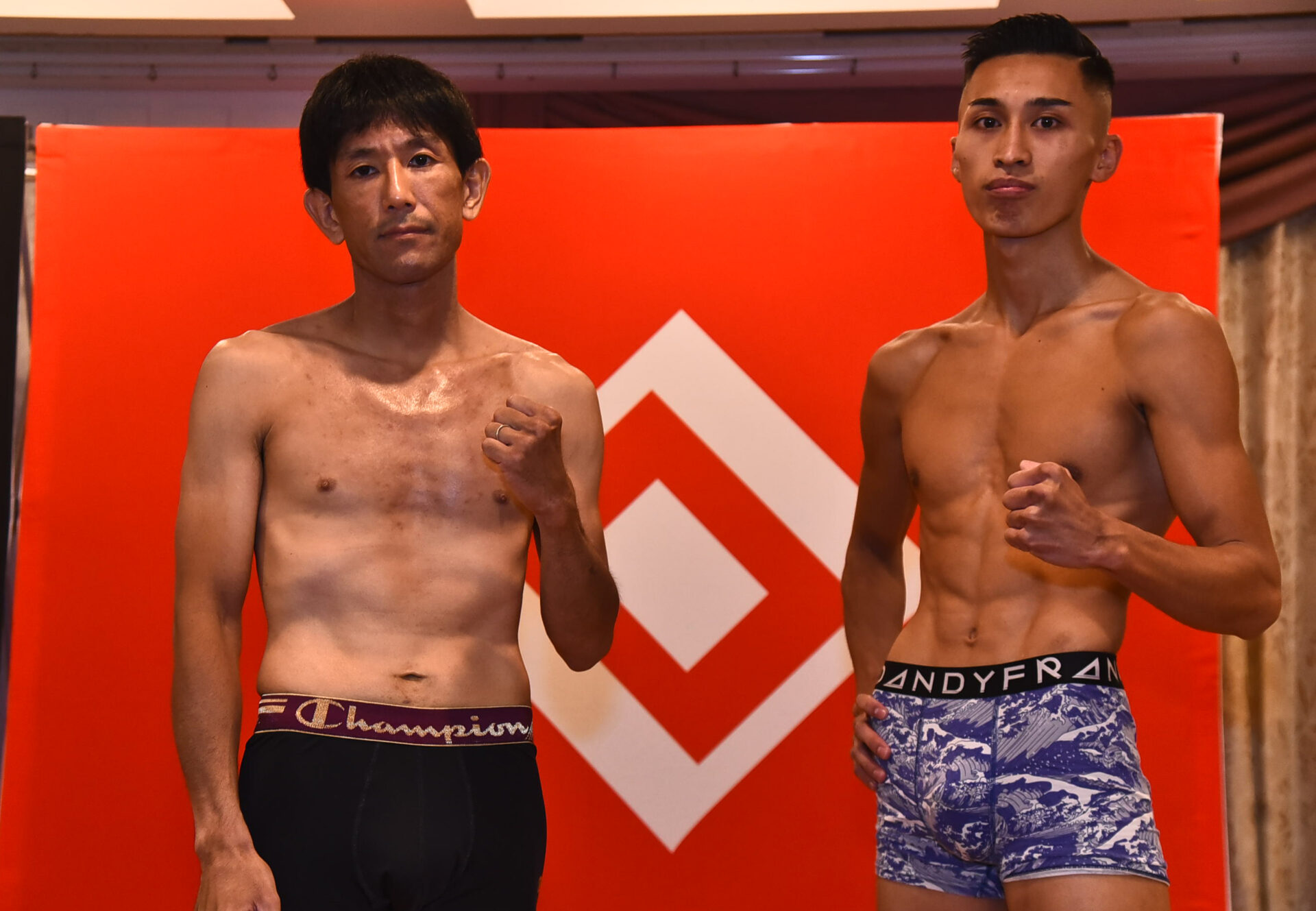 乙津陸(クロスポイント大泉)51.9kg 「明日は俺の技のお披露目会をするので、応援よろしくお願いします。 (計量で相手を見て感じたこと)やはり小さいなという感じです。 (アピールしたいところ)明日は俺の成長ぶりと、圧倒して勝つ姿を見てほしいです。 (計量時のダルマのパンツの意味)ダルマはかわいいなと思って履きました(笑)。 (ファンにメッセージ)明日、6戦6勝4KOにします。ベルトが早く欲しいので、とっととぶっ倒したいと思います」