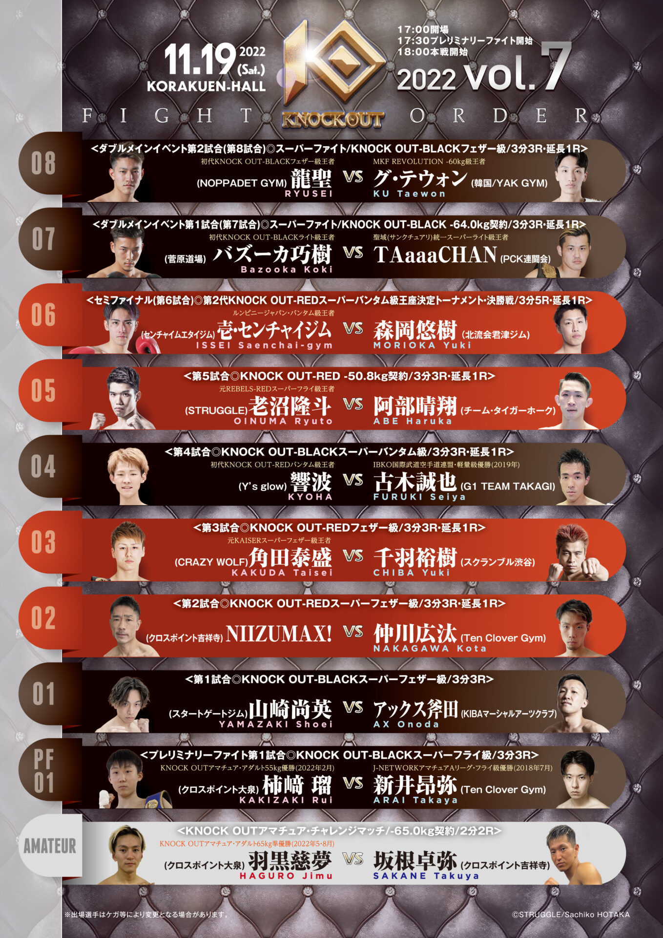 今大会より「KNOCK OUTアマチュア・チャレンジマッチ」の実施が決定しました。これは、KNOCK OUTアマチュア大会において優秀な成績を収め、今後KNOCK OUTでプロデビューを目指すファイターに、その前段階の育成マッチとして実施するものです。 今大会は17:00開場、17:30よりアマチュア・チャレンジマッチとプレリミナリーファイト1試合を実施し、18:00より本戦8試合を行います。