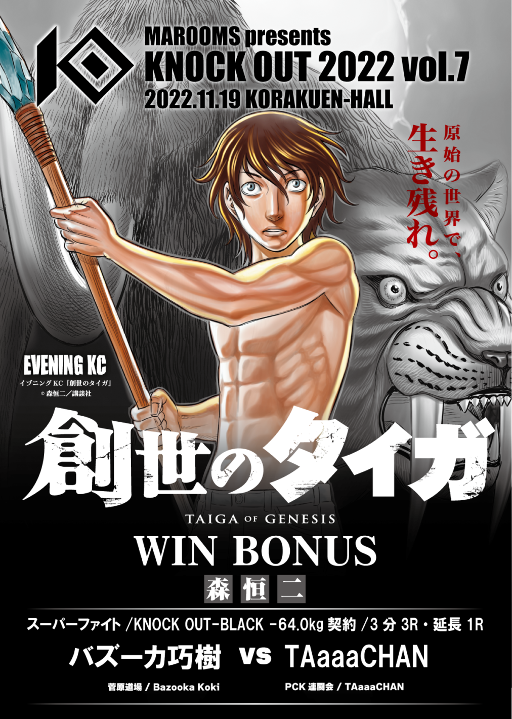 2022年11月19日(土)後楽園ホールで行われます MAROOMS presents『KNOCK OUT 2022 vol.7』の下記試合に「創世のタイガ賞」として、WINボーナスが贈られることが決定いたしましたので、お知らせいたします。