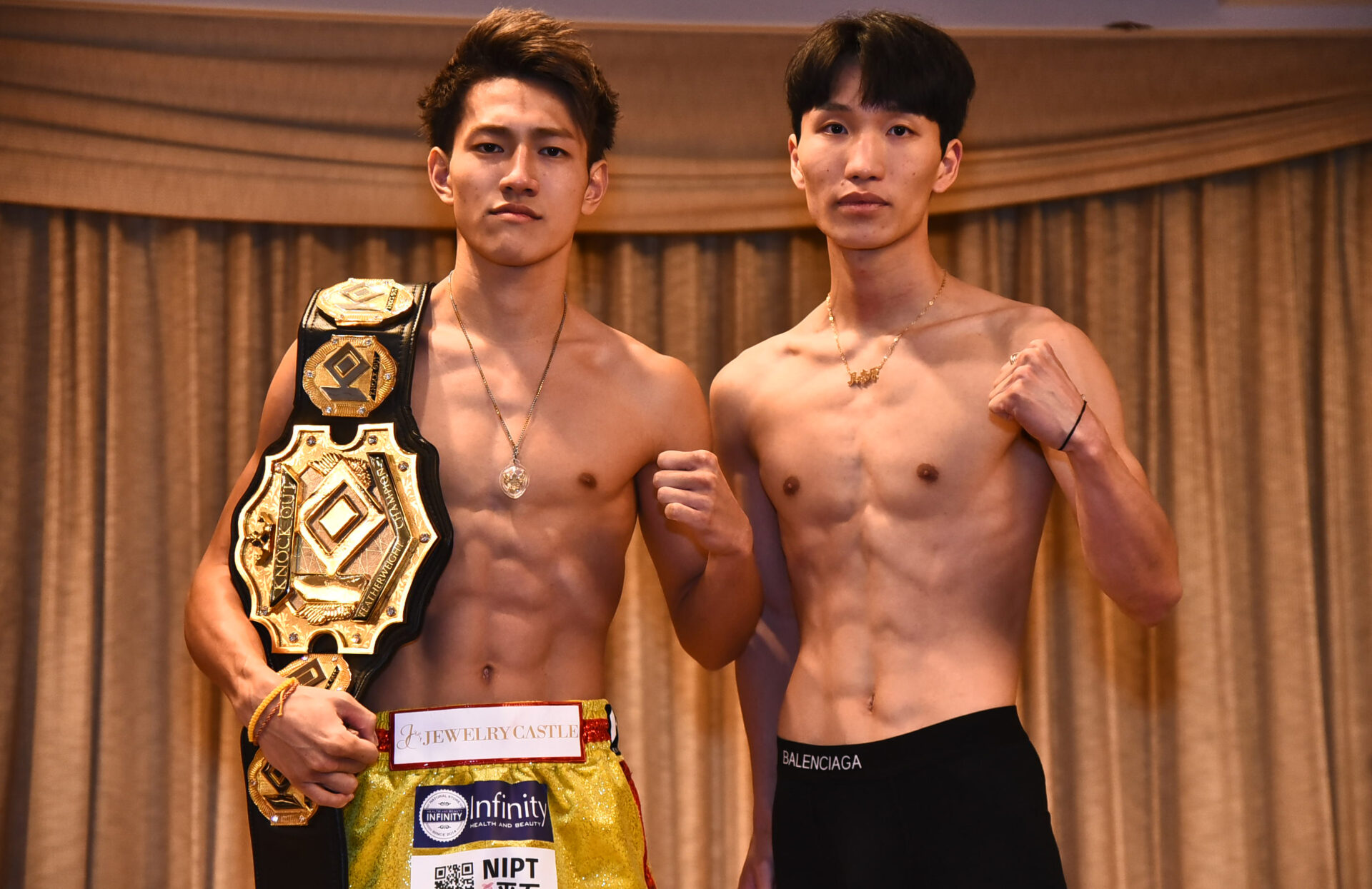 初代KNOCK OUT-BLACKフェザー級王者・龍聖(NOPPADET GYM)は57.5kg、グ・テウォン(韓国)は57.3kgで計量をクリアーし、あとは試合のゴングを待つのみとなった。