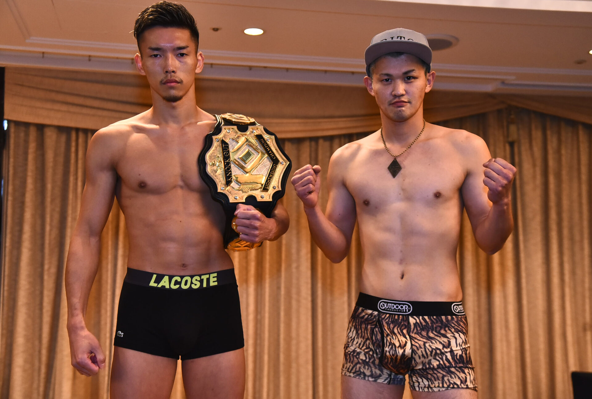 KNOCK OUT-BLACKライト級王者・バズーカ巧樹(菅原道場)、TAaaaCHAN(PCK連闘会)は共に64.0kgで計量を一発でクリアーした。