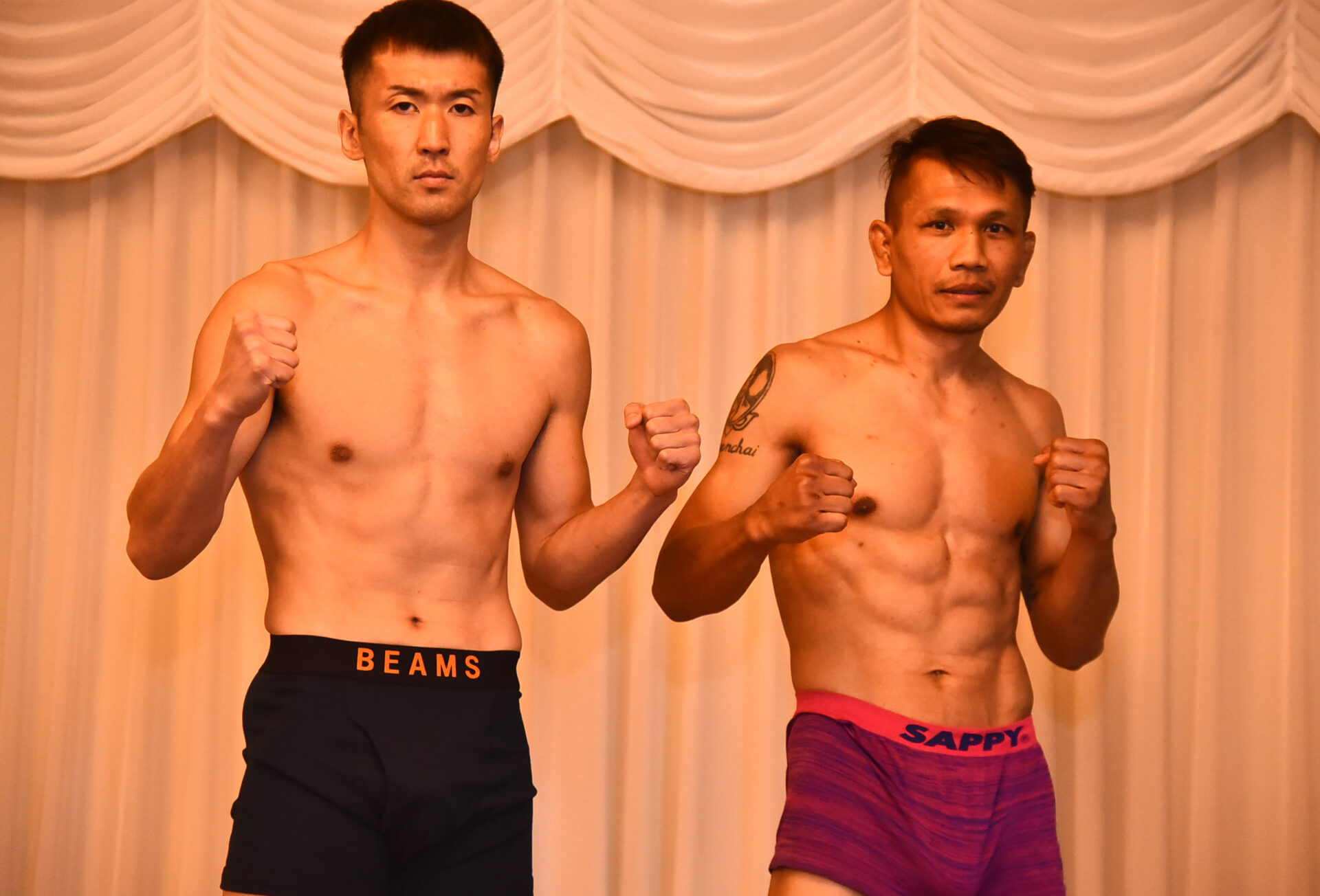初代KNOCK OUT-REDフェザー級王者・小笠原瑛作(クロスポイント吉祥寺)とタイ国ラジャダムナンスタジアム・フェザー級9位のチャーパヤック・サクサトゥーン(タイ)は共に57.3kgで計量をクリアーし、あとは試合のゴングを待つのみとなった。