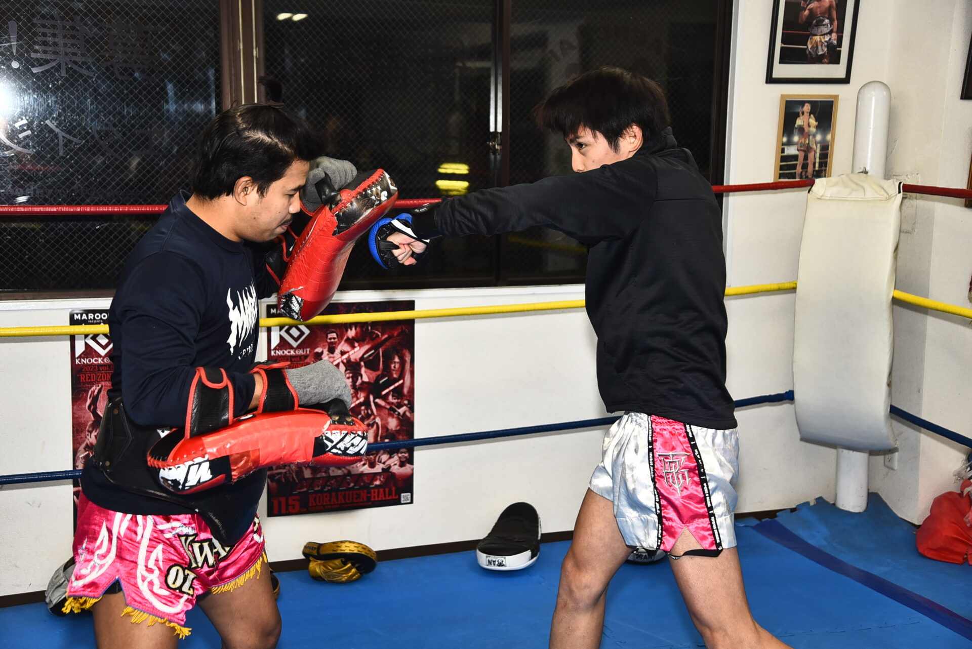 今大会は本戦全試合がオープンフィンガーグローブ(以下OFG)使用によるヒジ打ちありのREDルールで実施されることから、OFGをはめた壱がトレーナーを相手に2分1Rのミット打ちを行い、左ミドル連打とパンチをテンポよく打ち込み、ジム内に快音を響かせた。