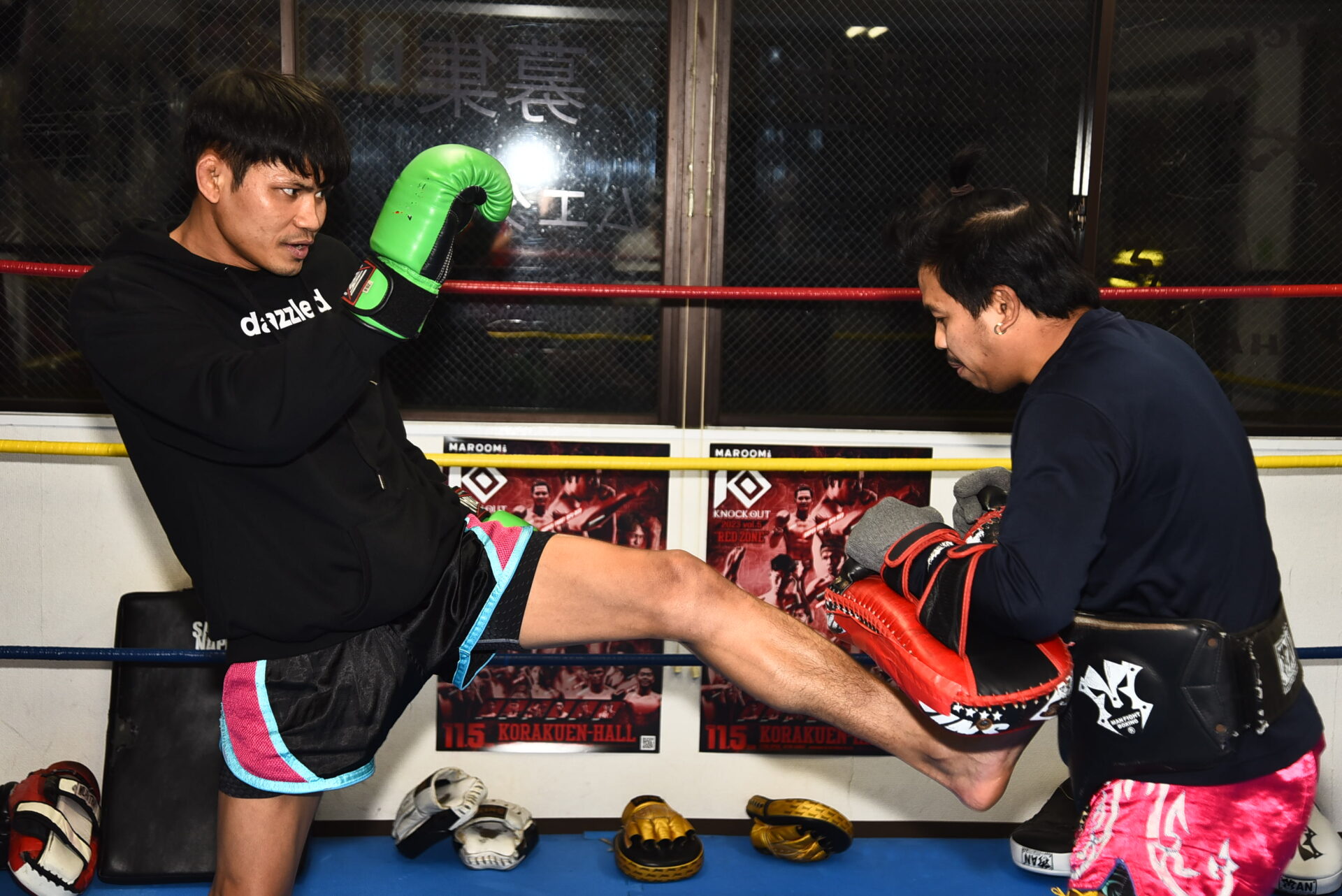 2023年11月5日(日)東京・後楽園ホールにて開催される、MAROOMS presents『KNOCK OUT 2023 vol.5 “RED ZONE”』に出場する壱・センチャイジムとルンペット・センチャイジム(タイ)が所属するセンチャイムエタイジムにて公開練習を行った。