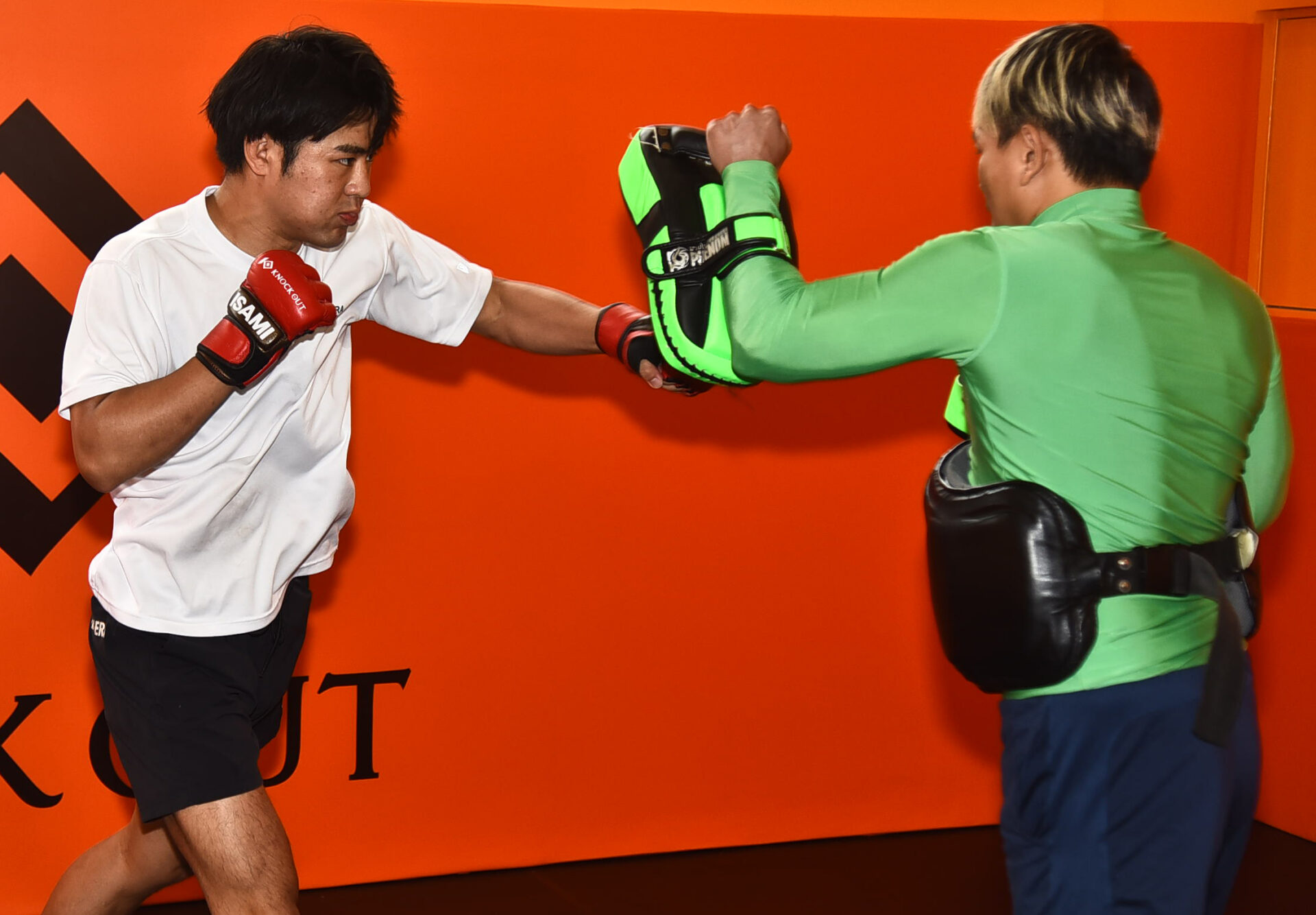 4月の『ONE FRIDAY FIGHTS 60』でソーンスックノーイに判定勝ちし、約2カ月の期間で試合が決まった小笠原。ここ数戦はタイでのONEの試合が増えてきているが「どこの試合でも対策練習とかは変わらないですけど、日本だと飛行機での移動時間とかで調整することの疲れもないし、日本の方がやりやすい。前回のONEからそんなに期間も空いてないのですが、ケガを治しつつ段々と調子を上げていき、試合のイメージも膨らんできていい感じです。疲れも溜まってきていますが、その中でも集中してコンディションを作れています」と試合に向けての調整はうまくいっていると話す。この日の公開練習ではタイ人トレーナーを相手に、ミット打ちを披露し、ジム内に快音を響かせた。