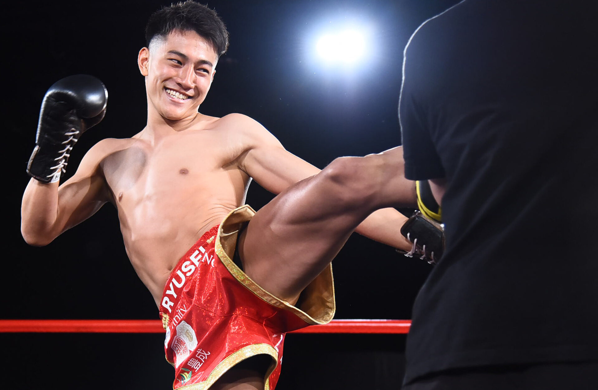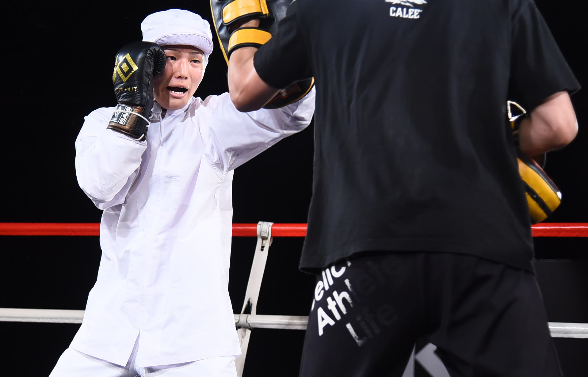割烹着を着たままミット打ちを披露した山田に対し、龍聖も迫力のミット打ちで好調をアピールした。