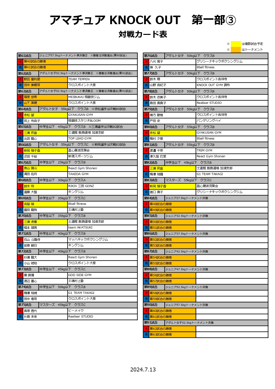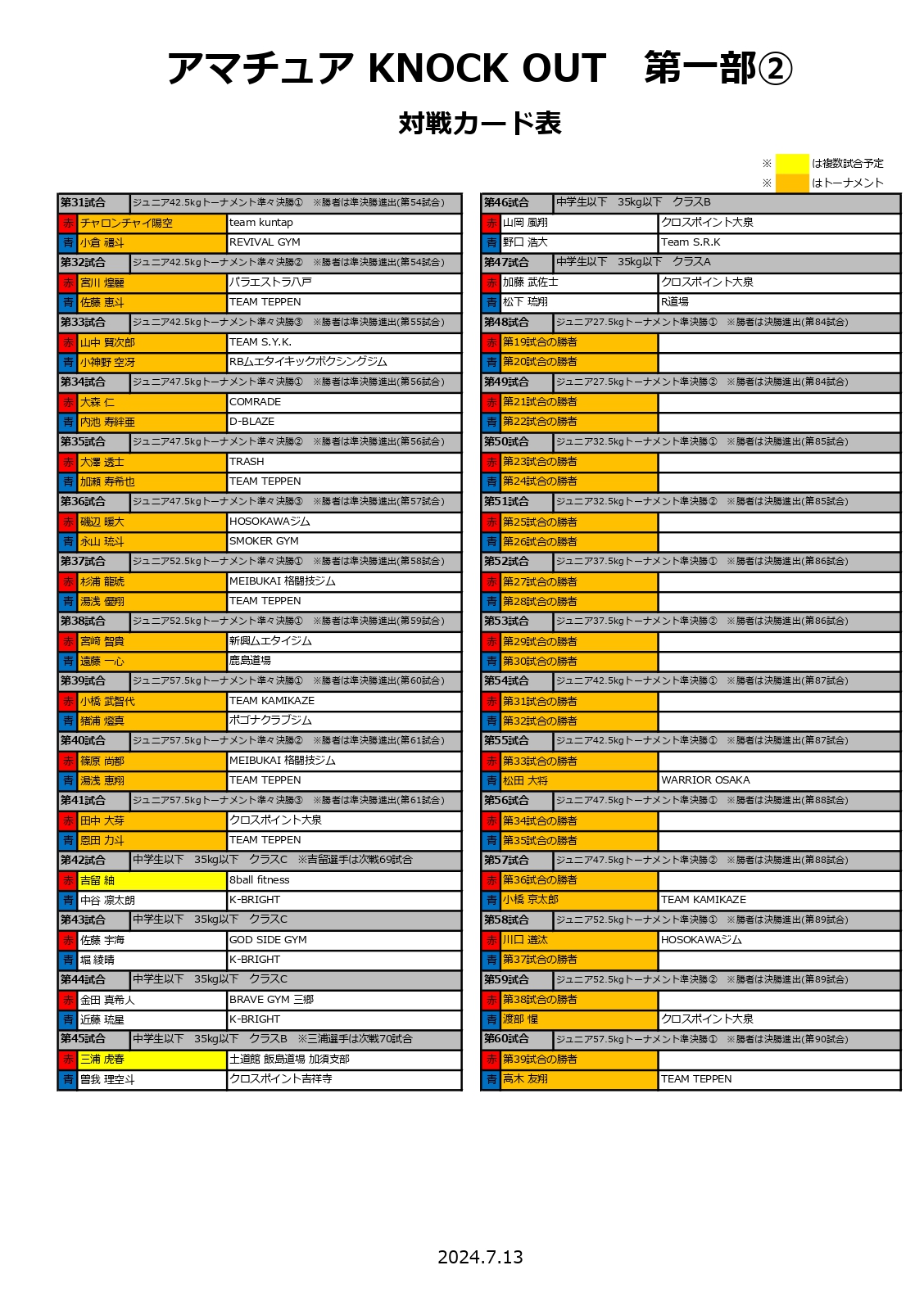 ※今大会は多数ご応募いただいた為、第一部の選手受付・計量、並びに試合開始時刻を1時間早めております。参加者の方々はご注意の程、宜しくお願いいたします。