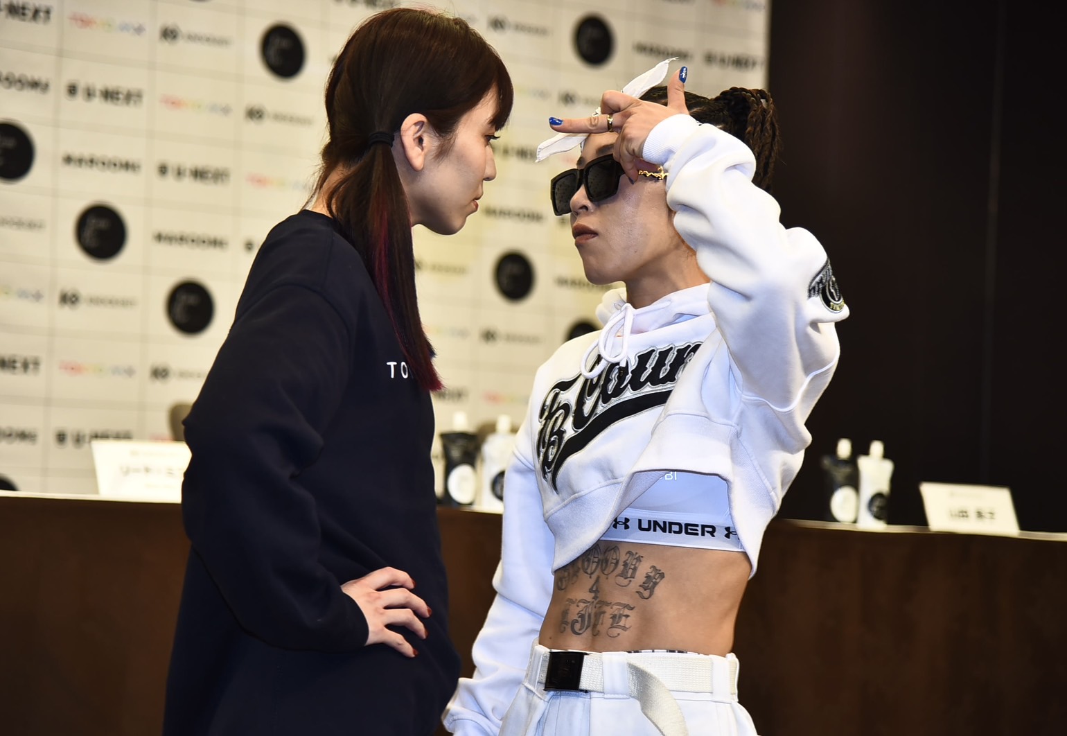 山田真子(GROOVY)=46.65kg 「明日は殺します。 (対戦相手の心境)さっき言ったとおり殺すしかないです。 (ケンカしに来ることですか)自分もタイマンはりに来ました。 (今までのルールの若干の違いに関して。長いリーチの攻撃への対策に関して)チームでバッチリやってきているので大丈夫です。 (ぱんちゃんは「試合が決まってから山田は一度もSNSを更新していないことに不満をぶつけていたことについて)単純に仕事と練習で忙しくて。分かってくれている人は分かってくれているんで。それでワーワー言っているのは知っとったけん。でも、あいつと違って自分はSNSで生きてる人間じゃないんで、数字じゃないんで質だと思うんで」