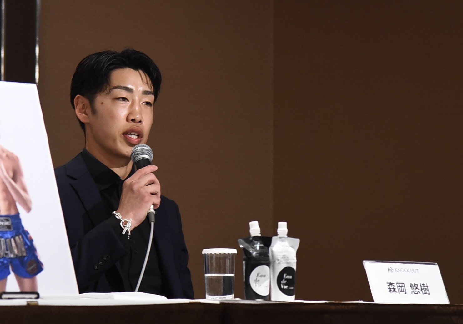 森岡悠樹 「前回の記者会見では参戦決定の発表だけだったんですが、今回はしっかり対戦相手がチャンピオンの壱と決まって嬉しく思っています。年末以上の激闘になるかちょっと分からないんですけど、本気で倒しに行こうと思っているので、是非楽しみにしてください。 (前回の試合を踏まえて今回はどういう試合をしたいか)自分は年末の続きを6月で皆さんにお見せできたらと思います。 (KNOCK OUTタイトル挑戦に関して)ベルトはもちろん欲しいとずっと思っているんですけど、今回、ベルトのことを考えすぎると固くなっちゃったり、勝ちに行くような試合は絶対にしたくないと思っているので、考えずに倒していきたいです。 (KNOCK OUTのベルトへの思い)本当にKNOCK OUTに出たての時なんか、こんなタイトルマッチに挑めることもなかったですし、こういう大きな舞台でタイトルマッチができて本当に嬉しいです。やっぱりKNOCK OUTのベルトは偉大なもんだと思っているのでほしいと思ってます。 (OFGでのアジャスト具合について)OFGだけが自分は最初不安でした。前回の試合前はスパーやマススパーでは普通のグローブを使っていたので、試合当日は距離感が合わなくてちょっと苦労したので、今回も決まってすぐからOFGでしっかりスパーも練習しているので完璧にアジャストできているのではないかと思います」