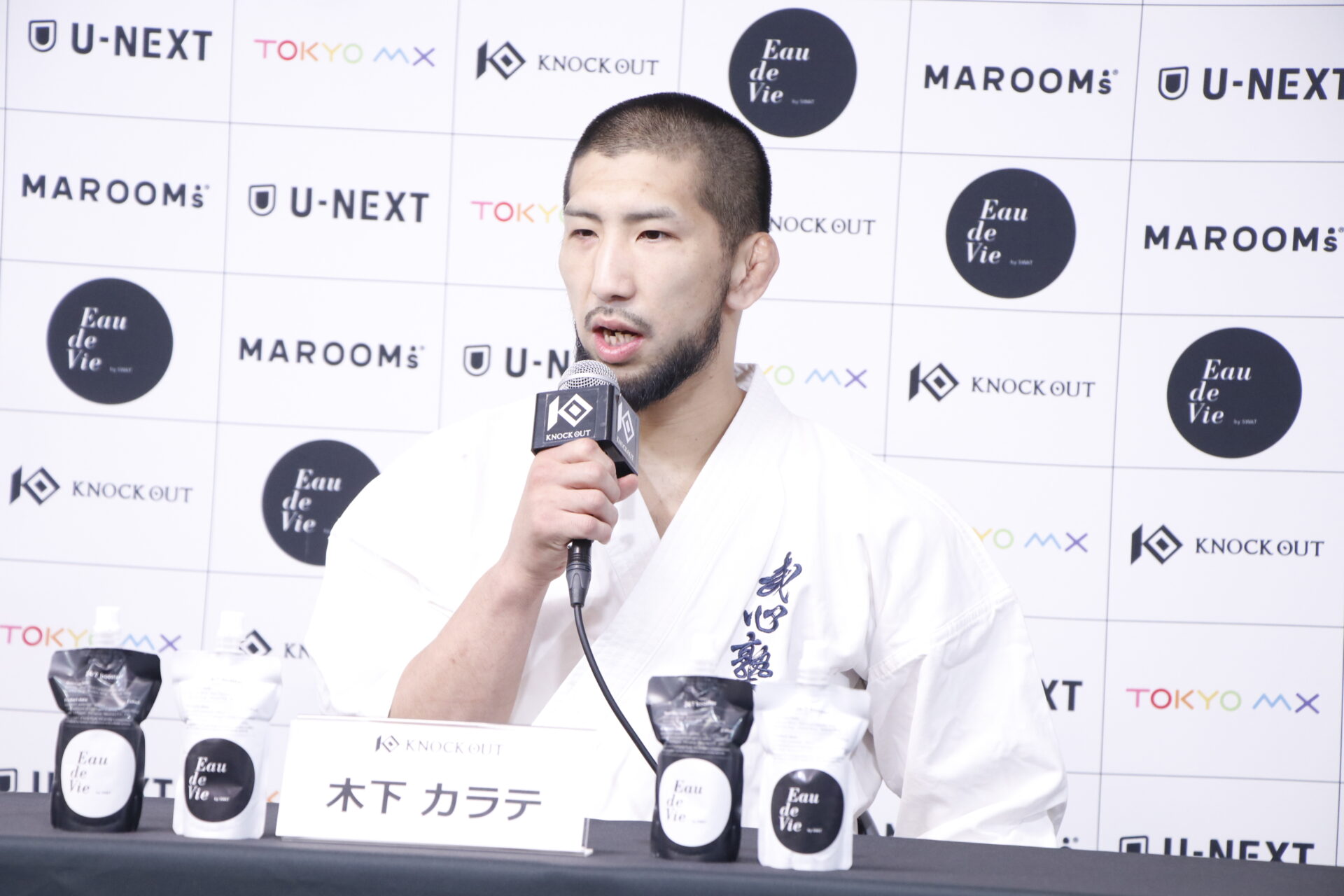 ・木下カラテ 「急遽代役で話を受けて、自分自身も高塩選手を以前から存じ上げていましたので、いい機会だなと思い試合を受けさせていただきました。個人的には二連敗した後での試合で、誰が相手でも自分の心の成長とかが試される試合になると思っているので、必ず倒しに行く試合を、また、UNLIMITEDルールでしか見せられない戦い方を見せたいと思います。 (対戦相手の印象)高塩選手はDEEPで何試合か見ていてストライカー寄りの選手だなと。ただそのストライキングが自分は空手ベースに対して、ムエタイっぽい感じなので、そういったところを踏まえつつ、一撃で倒すと言っていましたが、僕の一撃はちょっと違うよというのを事前に言っておきたいです。 (UNLIMITEDルールで大事なこと)ルール的には(MMAから)サブミッションがないだけなんですけれど、ただそれだけでMMAの抑え込んでいる間とか、立つ時に気を付けるところが変わってきます。3分間ずっと流動的なスクランブルの展開が続くような独特の競技だと思います。 (大沢代表からのアドバイス)あまり教えないです。 (フェイスオフの感想)戦うならあれくらい気合いが入っていないとと見ている人もこっちも楽しくないと思うので、いいガンの付け方だなと思いました。 (どんな試合を見せたいか)自分も同じようにこのルールでしっかり純度の高い格闘技を見せることと、何より自分自身に対して勝つこと、強くなることに誰よりも貪欲に、地獄に行くような試合を見せたいと思います」