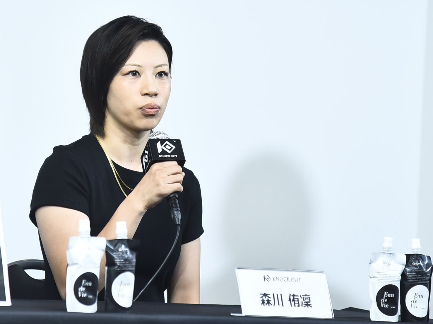 森川侑凜 「前回3年ぶりの復帰戦で、今まで以上に凄く楽しく戦えたので、今回も楽しんでしっかり勝って、また会場を盛り上げたいと思います。 (前回の相手の試合を見た印象)全部を通しては見てないんですけど、SNSで切り抜きのKOシーンが結構流れてきて、いい勝ち方をしてるなと思いました。 (KOしたハイキックについて)自分は自分らしい戦い方したらハイキックとか関係なしに倒せるんじゃないかなと思います。 (どう勝ちたいか)自分らしい戦い方で、自分にしかできない戦い方で、しっかり倒していきたいと思います。 (まだ制定されていないKNOCK OUT王座への思い)今、アトム級のベルトがない状態で、目標というのは明確にはないんですけど、前回みたいな戦い方で、もっともっと強くなっていったら、その先に見えるものがあるのかなと思います。 (自分の娘が格闘技をやりたいと言い出したら?)前回の試合を会場で見てたんですけど、多くの方に応援来ていただいて、ロビーでみんなと写真を撮る姿を見ていたのか、次の日、娘の写真を撮ろうとカメラを構えたら、ファイティングポーズするんです(笑)。そのうち、私の真似をして格闘技をやりだすのかなと思っています」