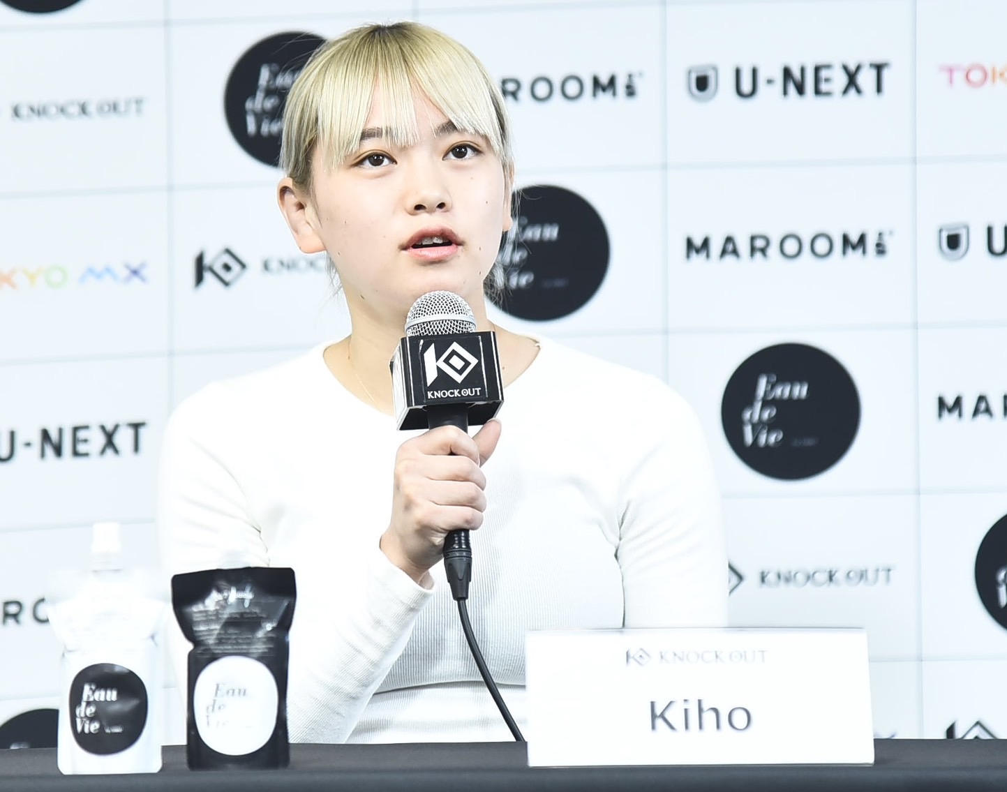 Kiho 「今回はしっかりと圧倒して勝ちます。 (前回の相手の試合を見た印象)凄くバチバチだと思いました。 (KOしたハイキックについて)あのハイキックは狙っていたわけではなく、むちゃくちゃ練習していたので出たんだと思います。 (それ以外の部分については)ダメダメでした。 (どう勝ちたいか)前回はたぶんヒヤヒヤさせて、もうダメだろうなと思われていたと思うのですが、今回はしっかり圧倒して最後は倒して勝ちたいと思います。 (まだ制定されていないKNOCK OUT王座への思い)ベルト欲しいので頑張ります。
