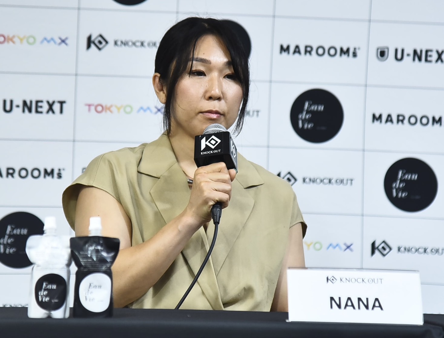NANA 「最強外国人を呼んでくださりありがとうございます。やることは変わらないので、しっかり潰して殴って蹴って勝ちたいと思います。 (対戦相手の印象)毎日試合映像を見てます。全部が強い、速い、回転力もあって飛ぶし回るし、可愛いし。潰すしかないと思っています。