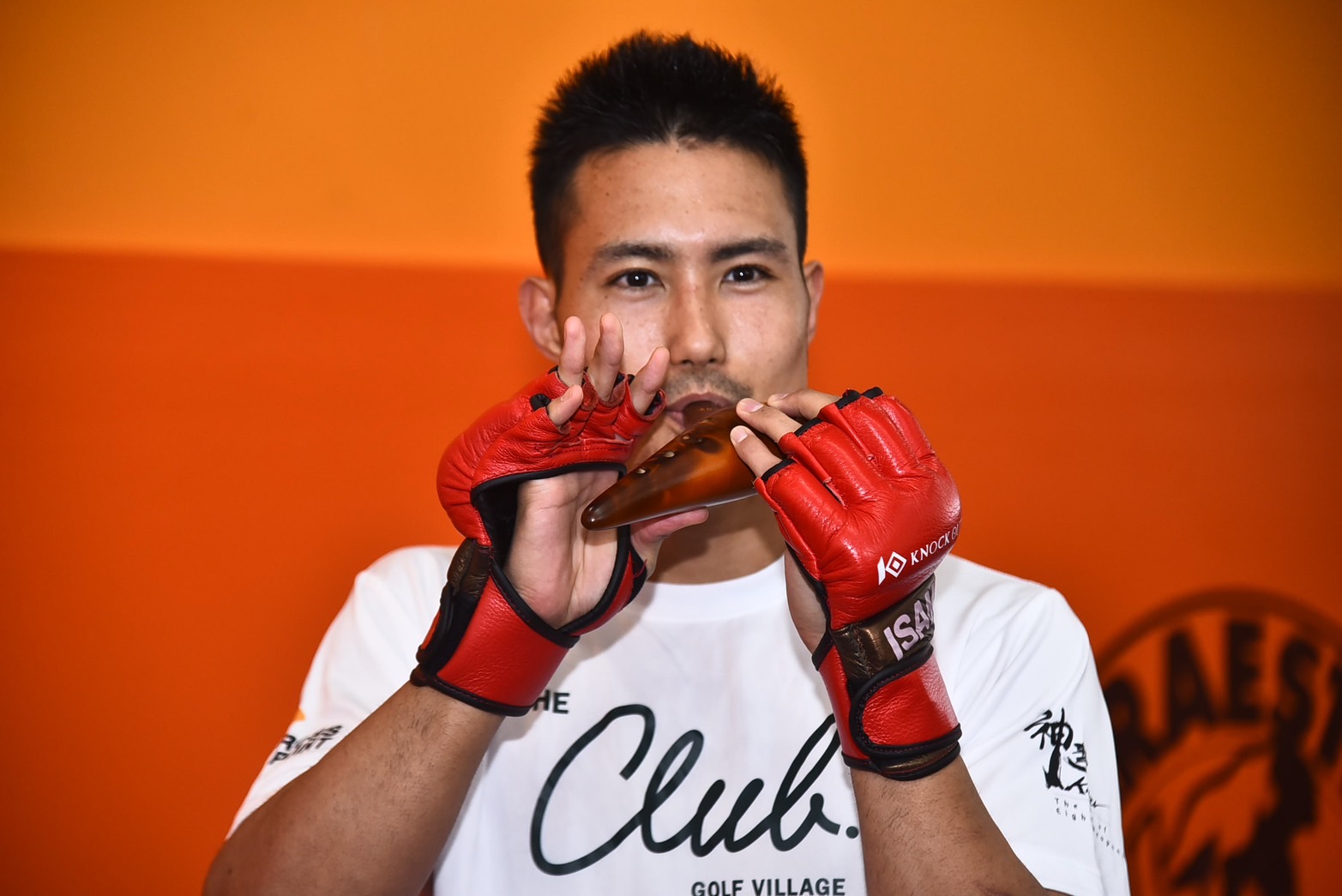 タイ人トレーナーが持つミットにキレのある左右ミドル、ヒジを打ちこみ快音をジム内に響かせて、好調をアピールした重森。ミット打ちを終えると、息を整えることもなくオカリナを吹く意外な一面を見せて公開練習を終了した。