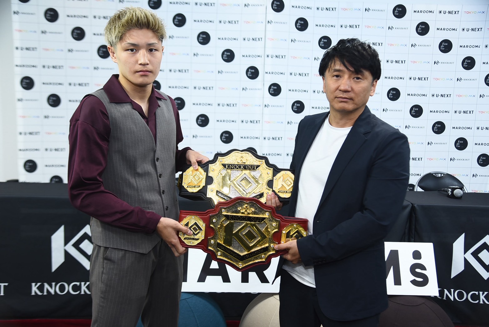 会見冒頭で久井は、ライト級に階級変更するために保持しているKNOCK OUT BLACK&REDのスーパーフェザー級の2本のベルトを返上。