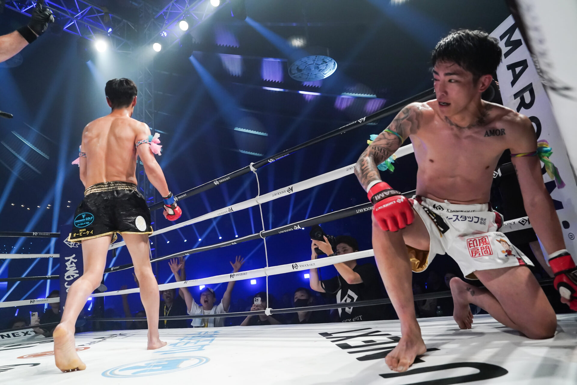 壱 そうですね。もう倒されたら行くと決めてたので。でも結局3Rしかないから、ダウンを取られたら行かないと勝てないなというのはもともと分かってたので。最初から、僕が当てたら僕が勝つし、森岡くんが当てたら森岡くんの勝ちという試合だなってのは思ってました。