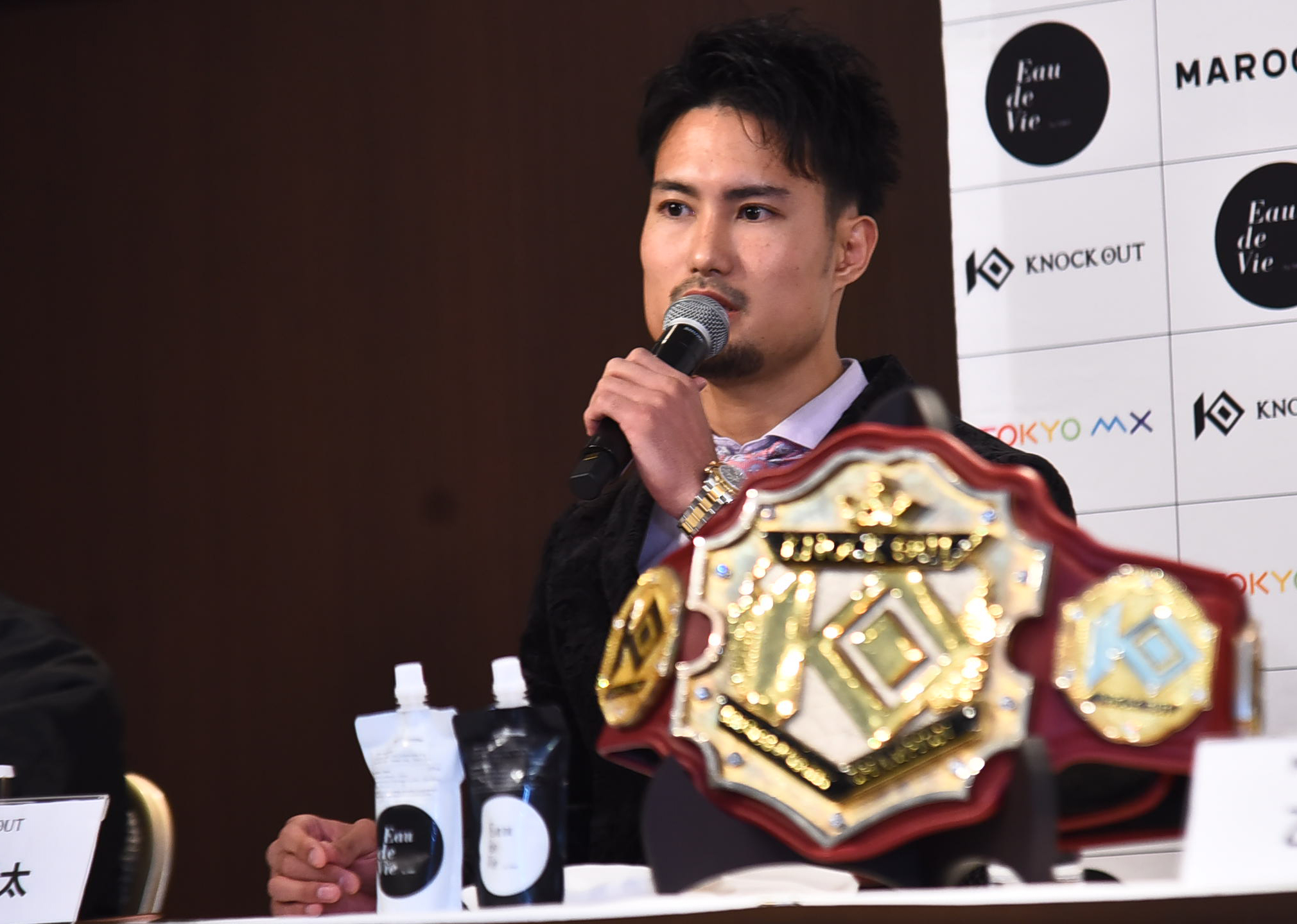 (保持しているベルトへの想い)このベルトは俺が絶対持っている方がこのKNOCK OUTの階級は絶対盛り上がると思うし、面白い試合を俺はできるんで、このベルトを欲しかったら、俺をぶっ倒さないと獲れないよというのを見せつけます」