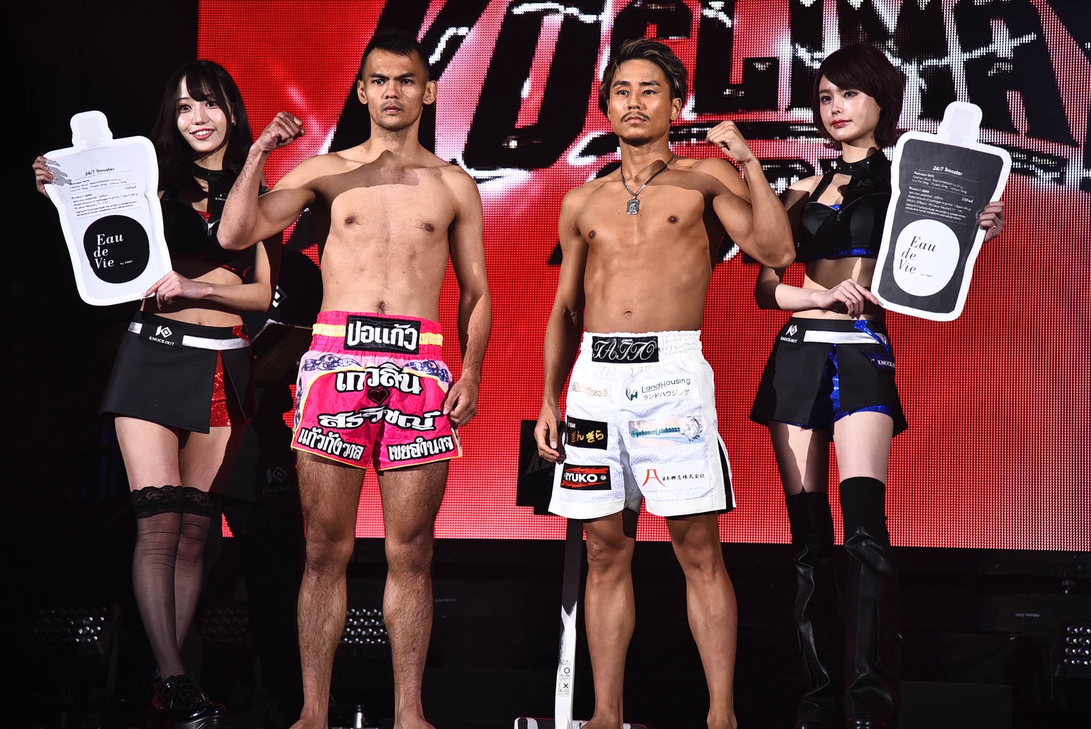 メインイベントのKNOCK OUT-REDライト級タイトルマッチで対戦する王者ゴンナパー・ウィラサクレック(タイ)は62.30kg、挑戦者の久井大夢(TEAM TAIMU)は62.40kgで計量をクリアー。