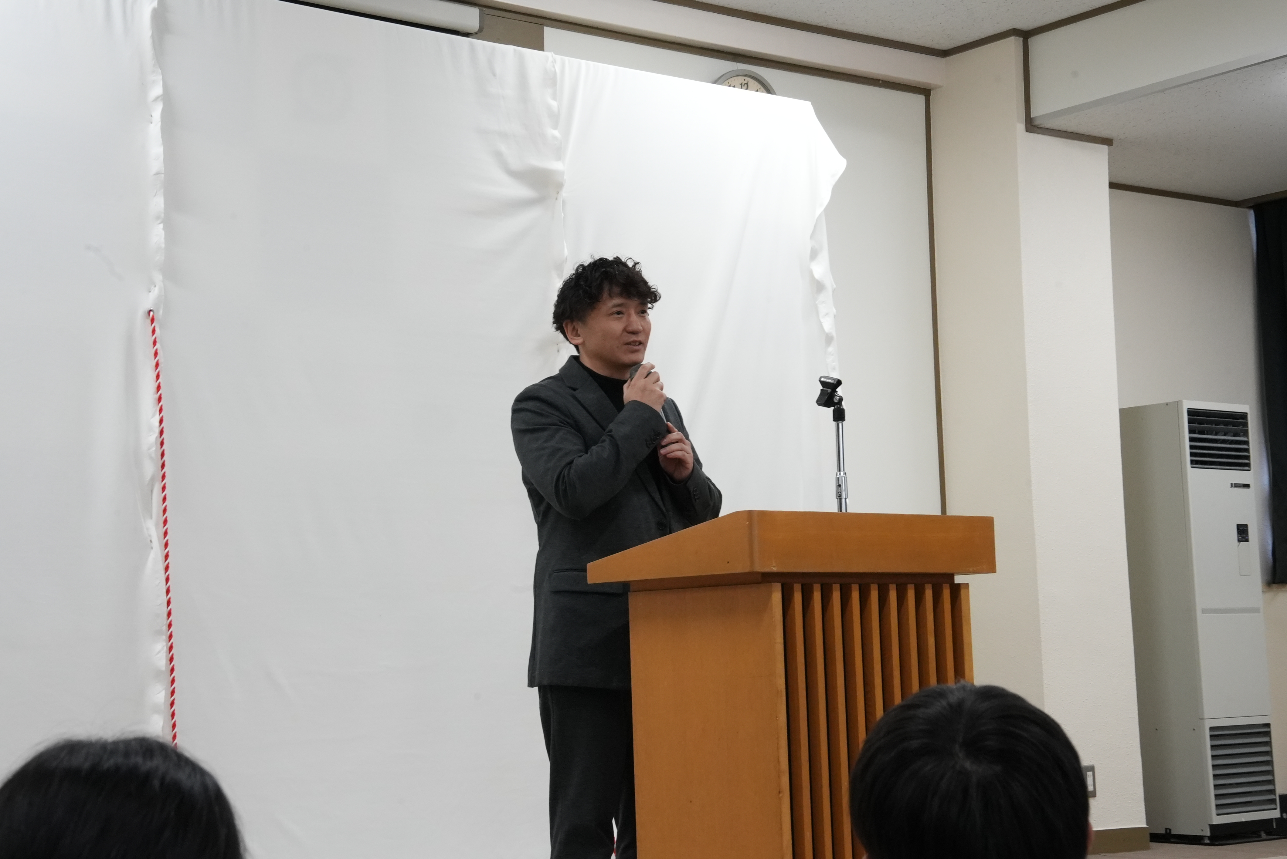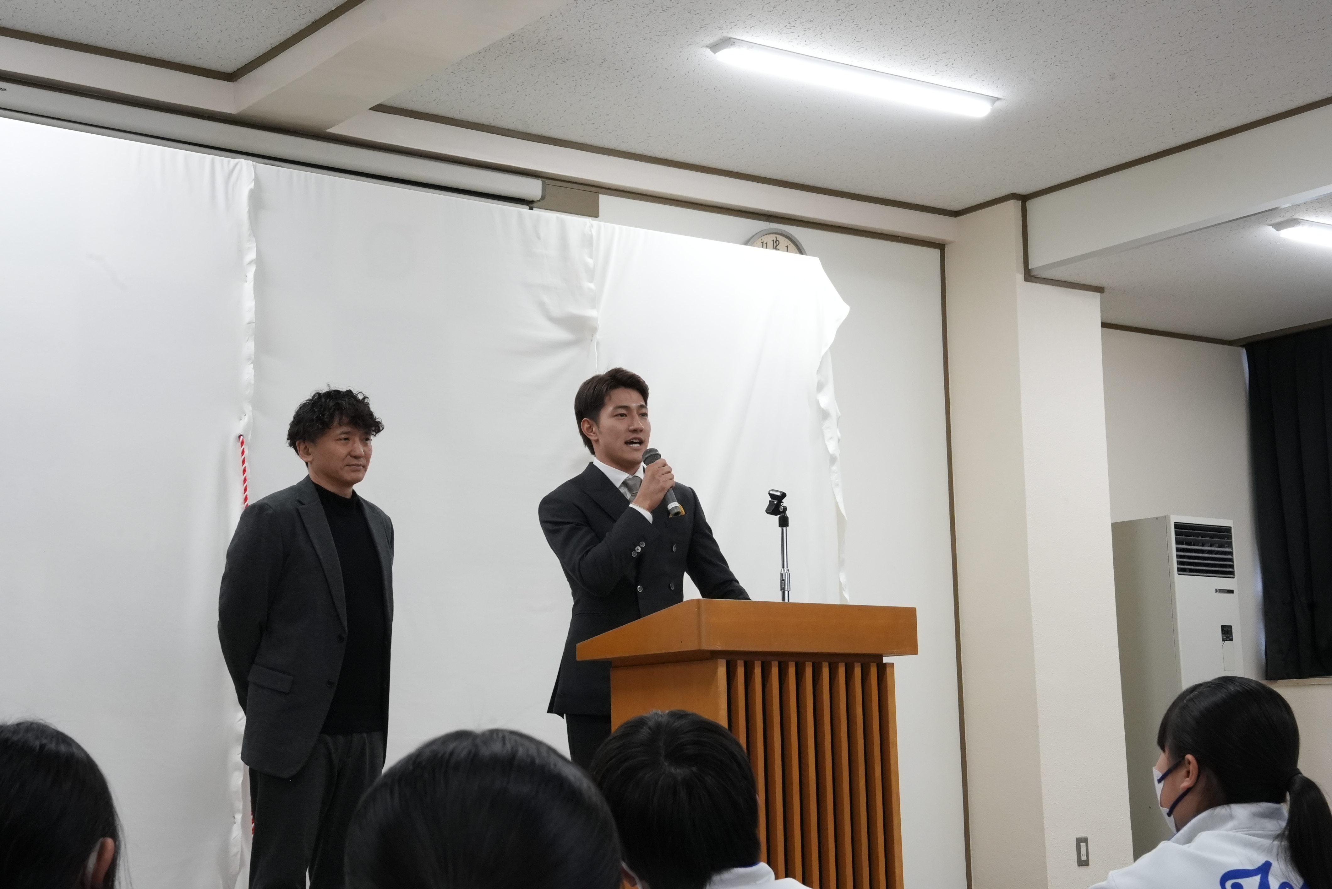 常葉中学校を訪問した際は全校集会の中で、KNOCK OUTから寄贈された部活動用物品の紹介と、寄付金の一部で制作されたバックボードの除幕式が行われました。式では龍聖選手とKNOCK OUT代表・山口元気より、生徒たちへ「礼儀の大切さ」や「部活動を通して得られる経験の価値」についてメッセージが送られました。
