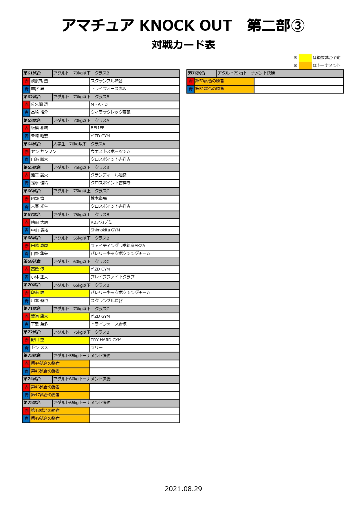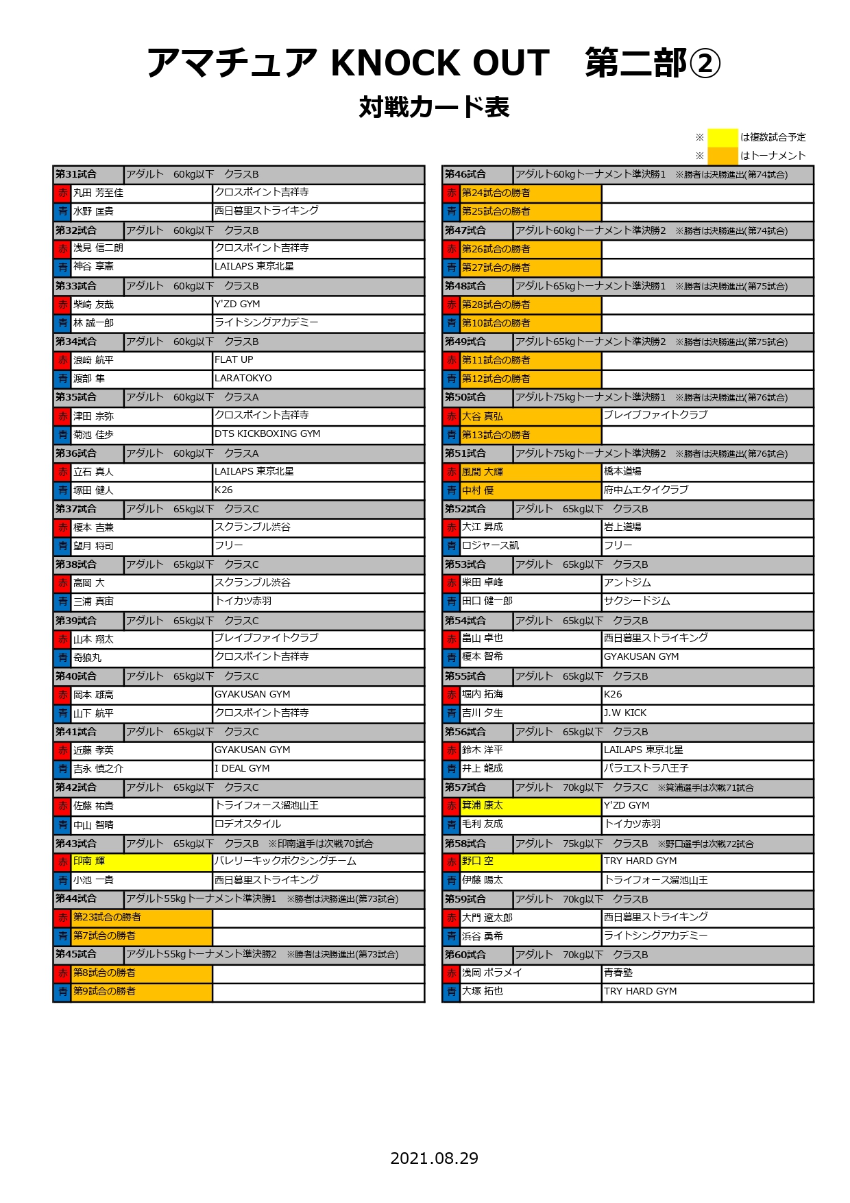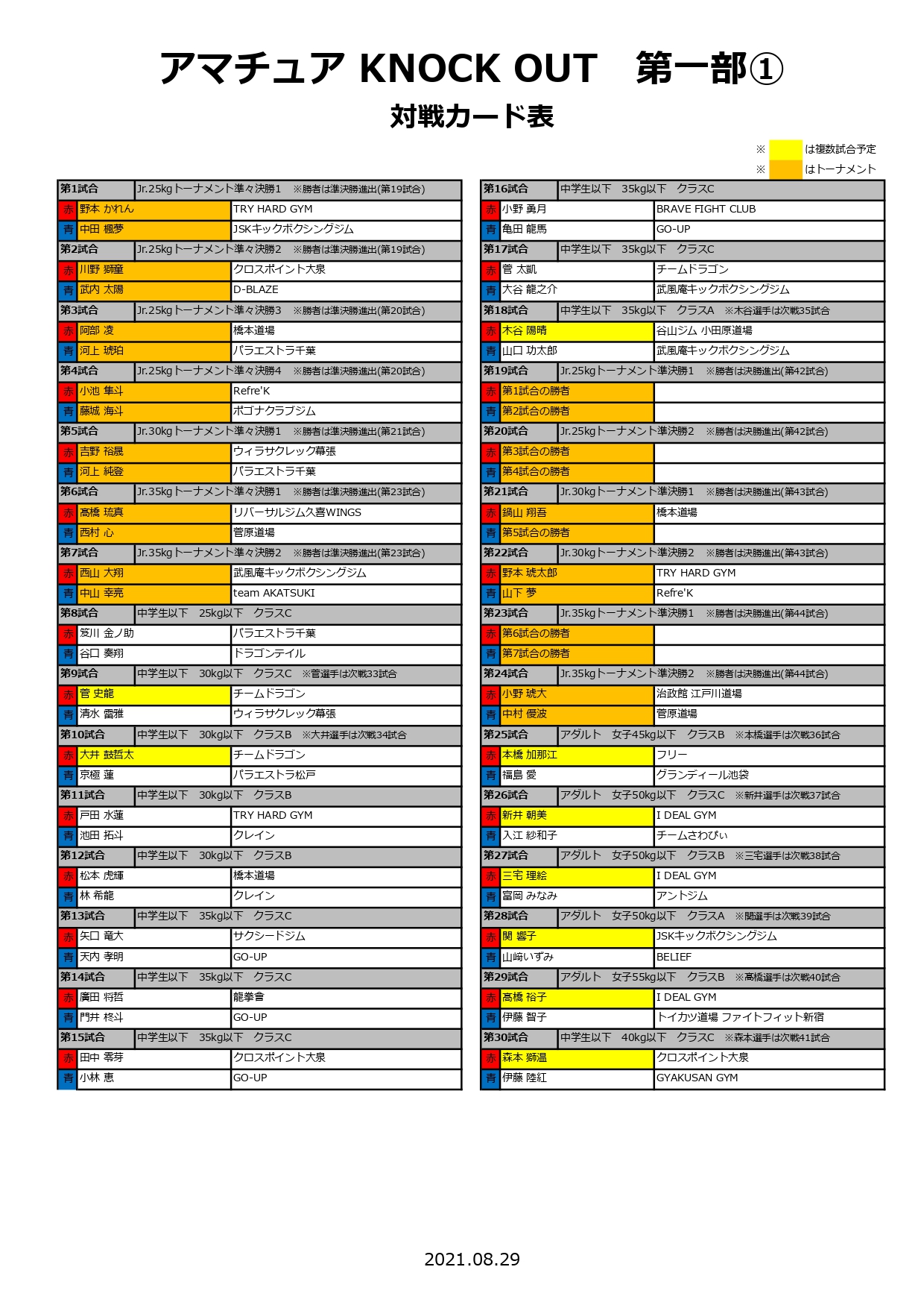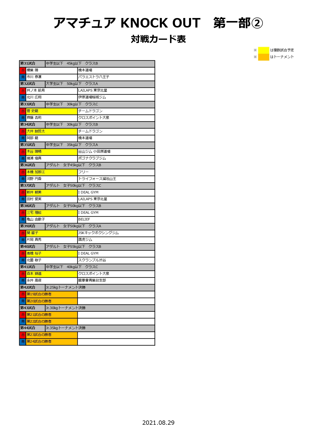 株式会社Def Fellowでは、2021年3回目の『KNOCK OUTアマチュア大会』を8月29日(日)新宿FACEにおいて開催します。 今大会では、クラスAで7つのカテゴリーにおいて「チャンピオン決定トーナメント」を実施。 中学生以下、高校生、大学生、アダルト、それぞれの部でワンマッチを全122試合を予定しています。