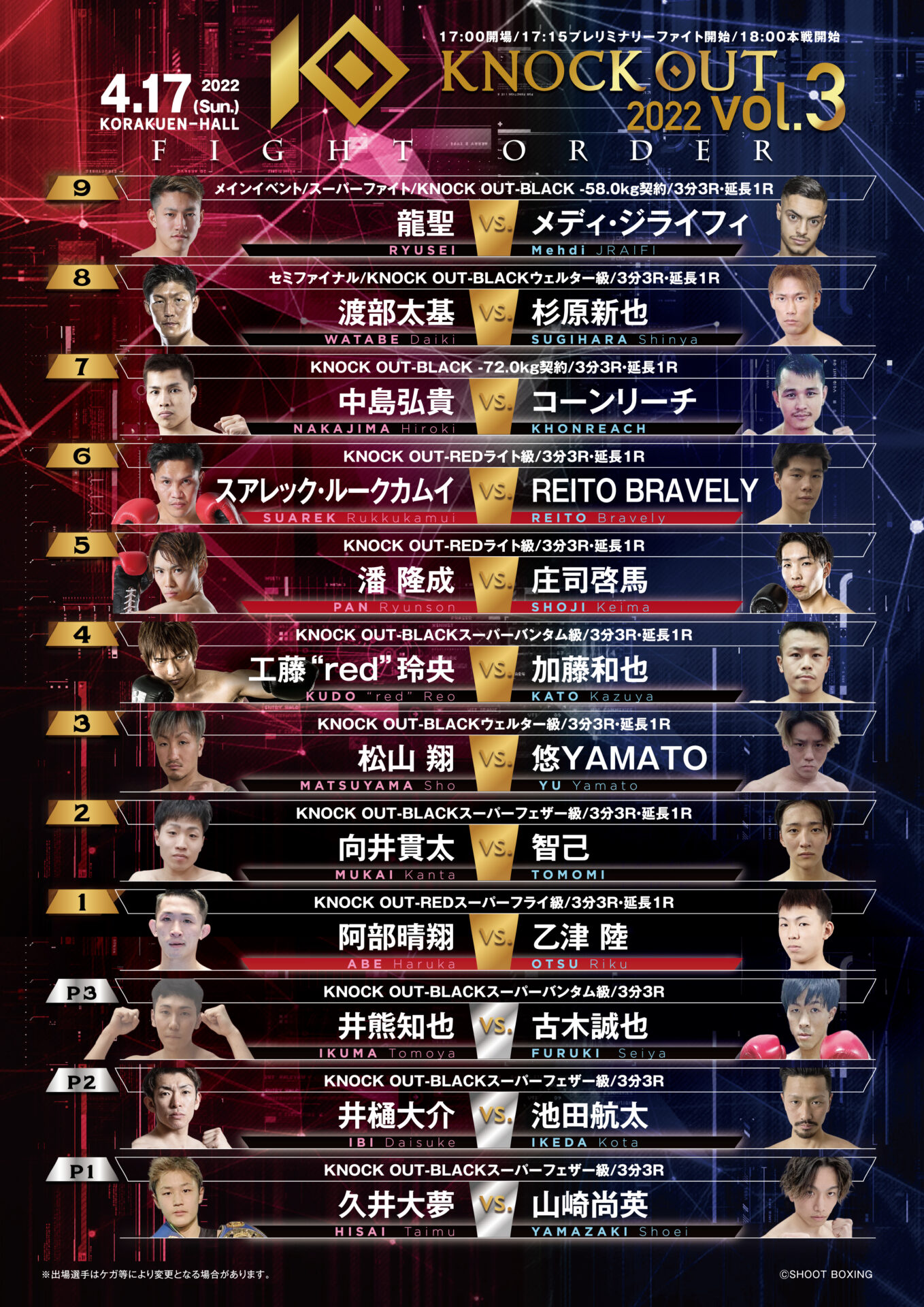 4.17 KNOCK OUT 2022 vol.3|全12カードの試合順が決定!
