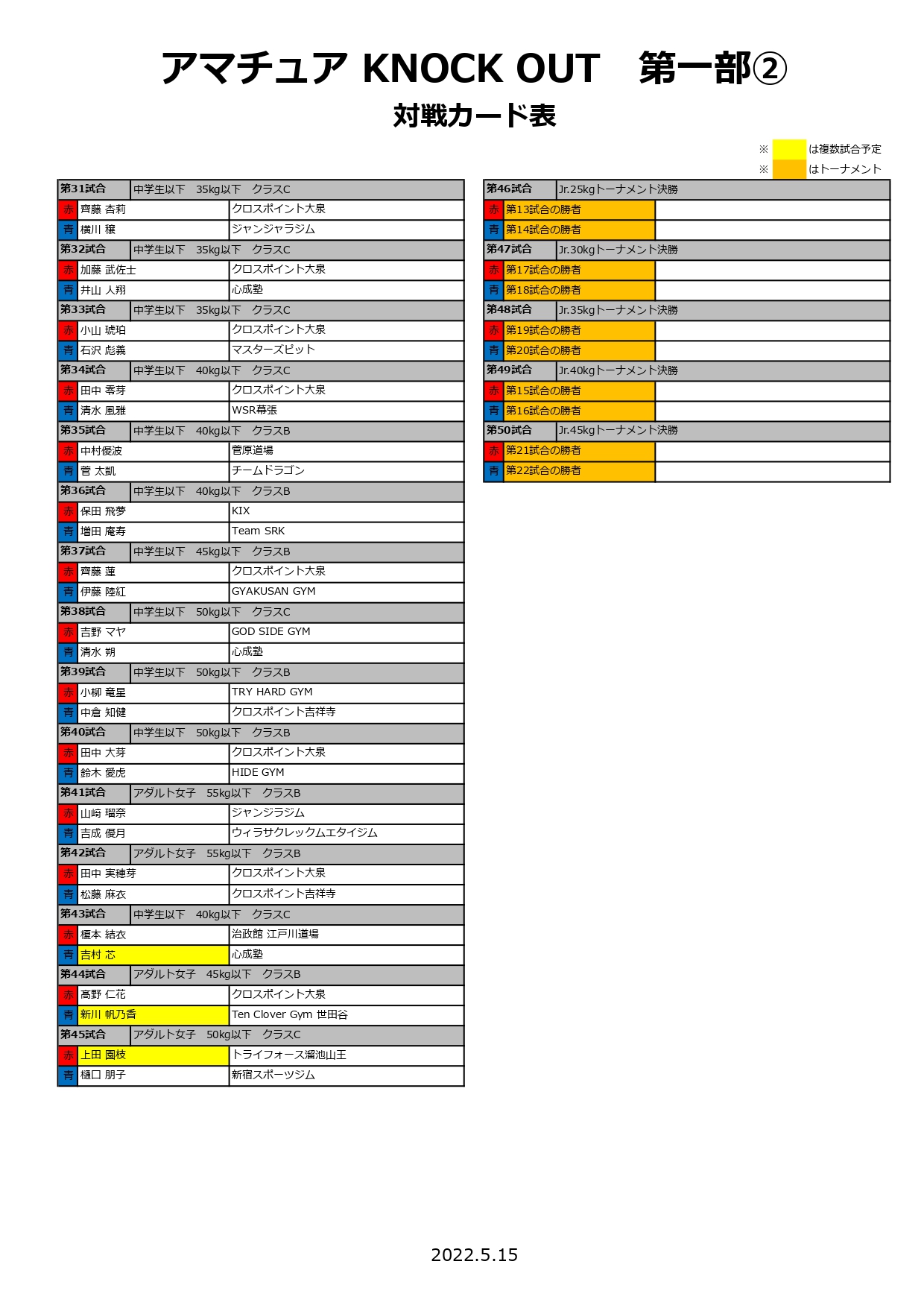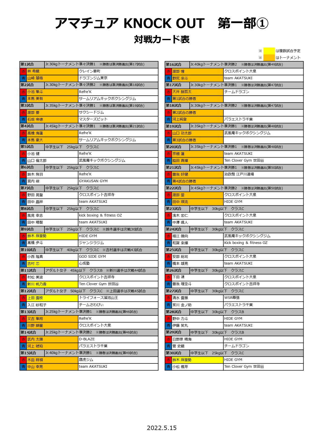 2022年5月15日(日)に新宿FACEで行われます「KNOCK OUTアマチュア」の対戦カードが決定いたしましたので、お知らせいたします。
