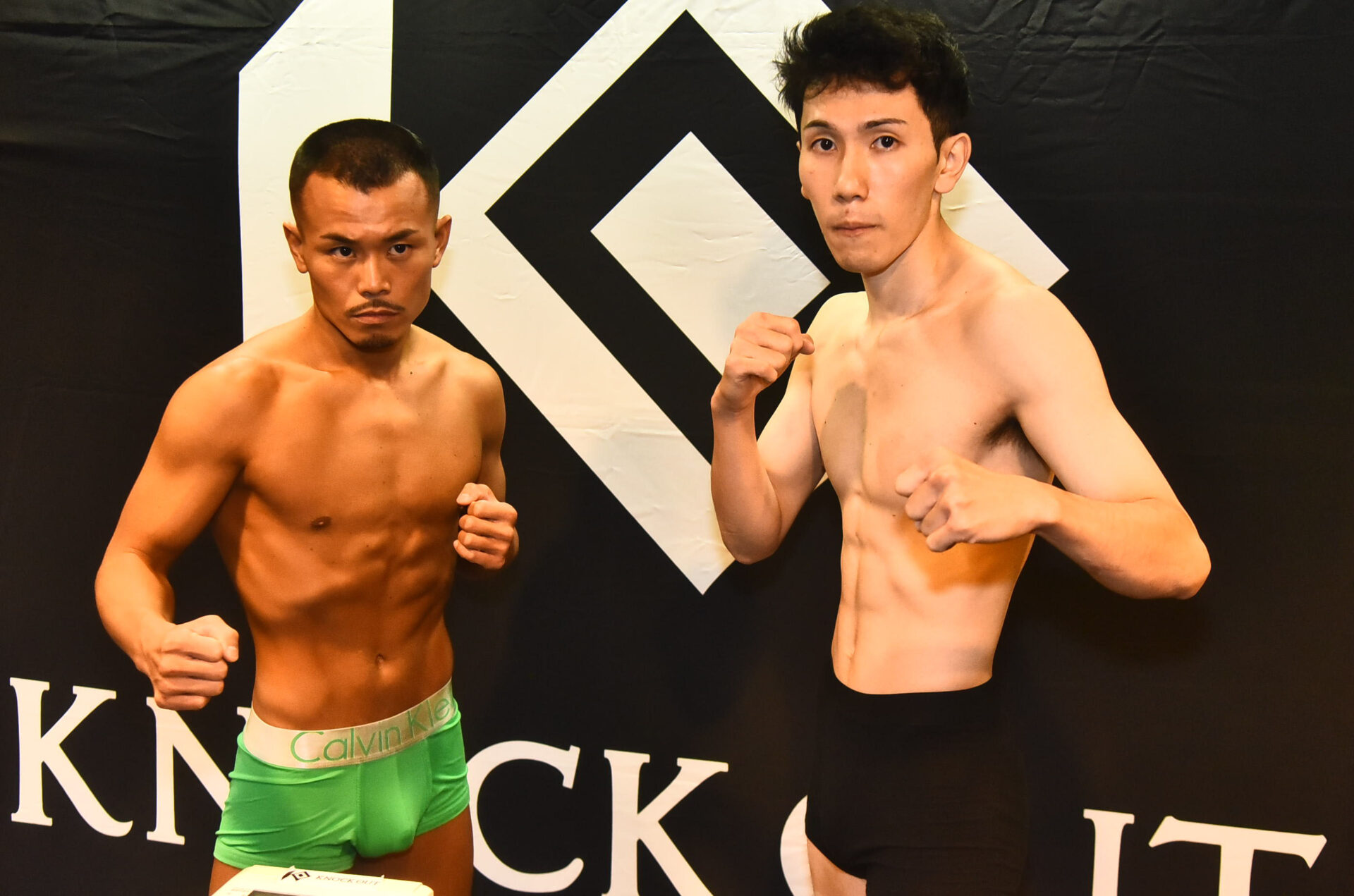 メインイベント(第6試合)のKNOCK OUT-REDスーパーフライ級(-52.0kg)で対戦する乙津陸(クロスポイント大泉)は51.8kg、谷津晴之(新興ムエタイジム)は51.65kgで計量を一発クリアーし、あとは試合のゴングを待つのみとなった。