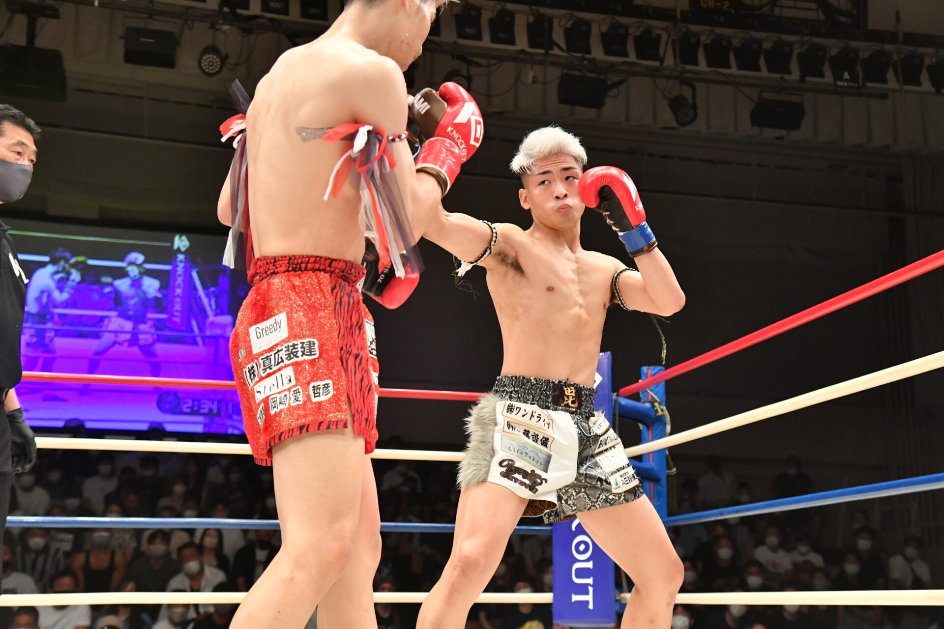 TAKERU 自分にとっては初のREDルールだったんですけど、栗秋選手は名のある選手で、『KNOCK OUT』の舞台でそういう選手に勝てたというのがすごくよかったですね。倒せなかったんですけど、ずっと練習していた技が試合で出せて、相手の動きを狂わせて自分の動きでしっかり戦えて勝てたと思います。
