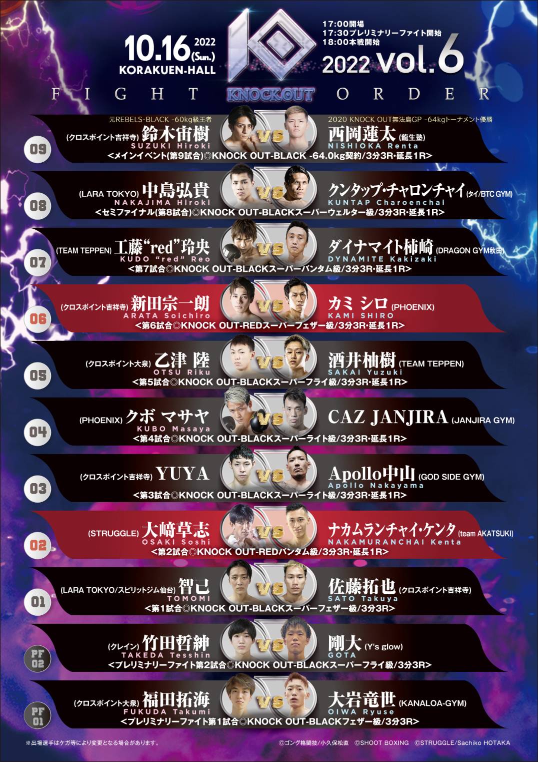 10.16 KNOCK OUT 2022 vol.6|全11カードの試合順が決定!