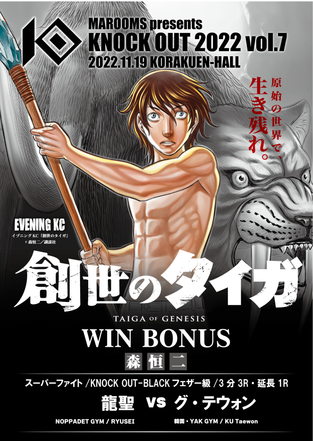 2022年11月19日(土)後楽園ホールで行われます MAROOMS presents『KNOCK OUT 2022 vol.7』の下記試合に「創世のタイガ賞」として、WINボーナスが贈られることが決定いたしましたので、お知らせいたします。