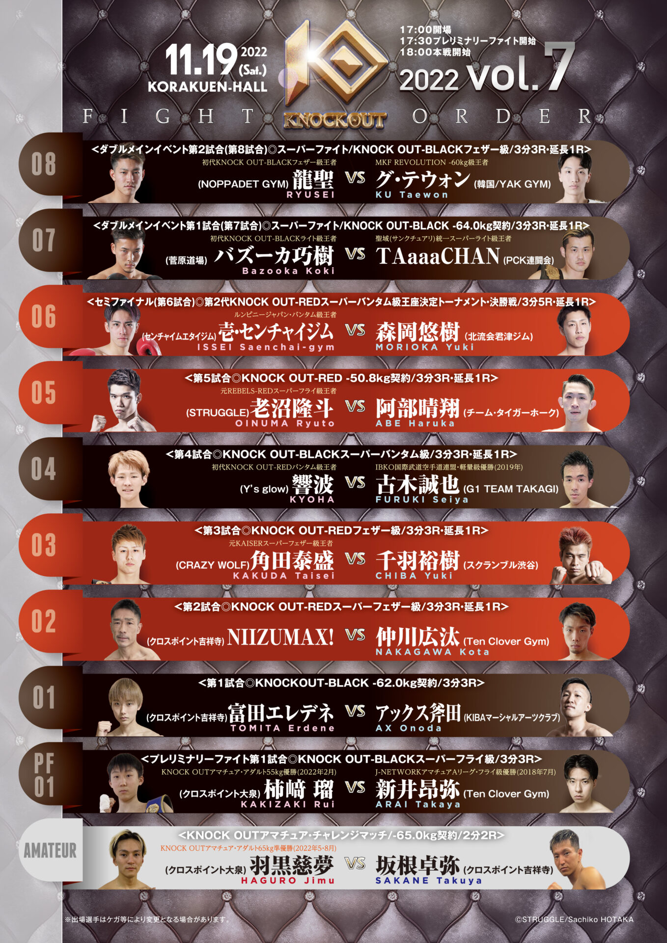 なお、試合前日の決定に伴い、KIBAマーシャルアーツクラブと協議の結果、この試合の契約体重は当初予定のスーパーフェザー級(-60.0kg)から「-62.0kg契約」に再設定。19:30から臨時公式計量を実施し、富田エレデネ選手は61.4kgでクリアしております。