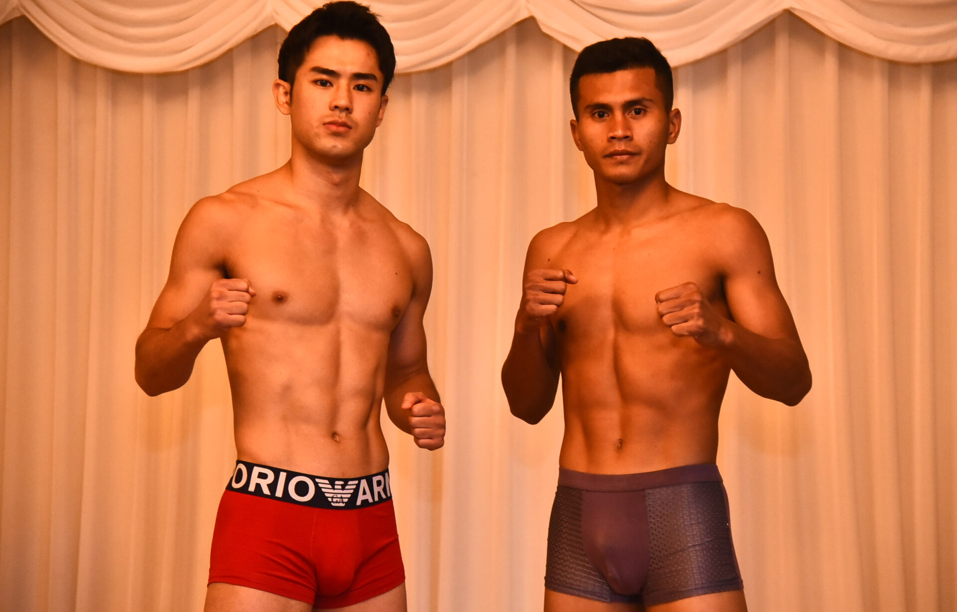 初代KNOCK OUT-REDフェザー級王者・小笠原瑛作(クロスポイント吉祥寺)とタイ国ラジャダムナンスタジアム・フェザー級9位のチャーパヤック・サクサトゥーン(タイ)は共に57.3kgで計量をクリアーし、あとは試合のゴングを待つのみとなった。