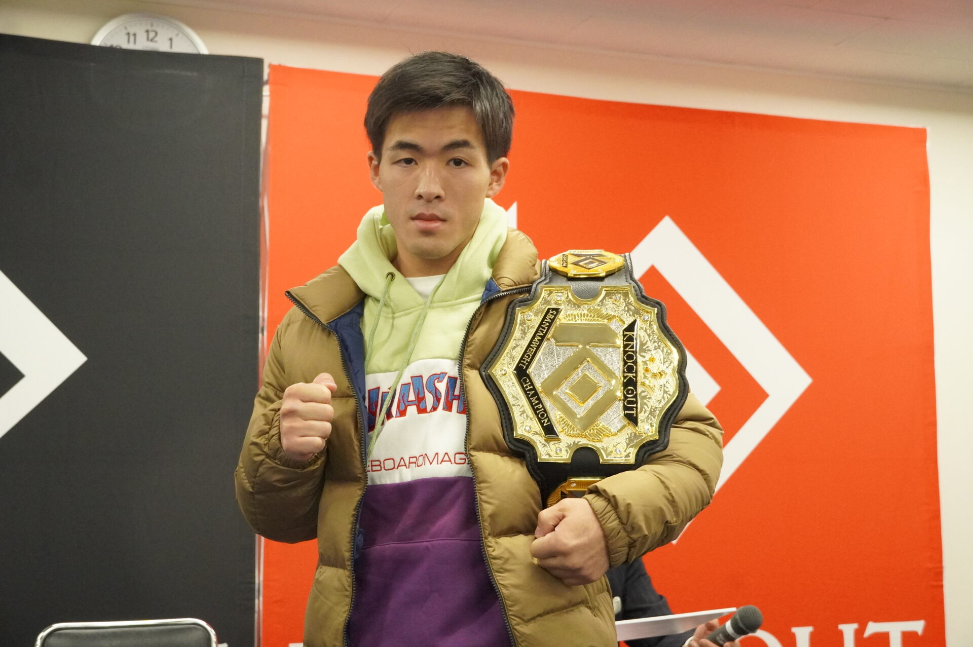 (ファンにメッセージ)こんな戦績トントンなチャンピオンですが、スーパーフライ級を引っ張っていく自覚ははっきり言って、誰にも負けない。どんな挑戦者が来ても絶対退けます。そして『KNOCK OUT』を更に盛り上げて、『KNOCK OUT STYLE』も盛り上げて、視聴率100%取っちゃうので期待してください」