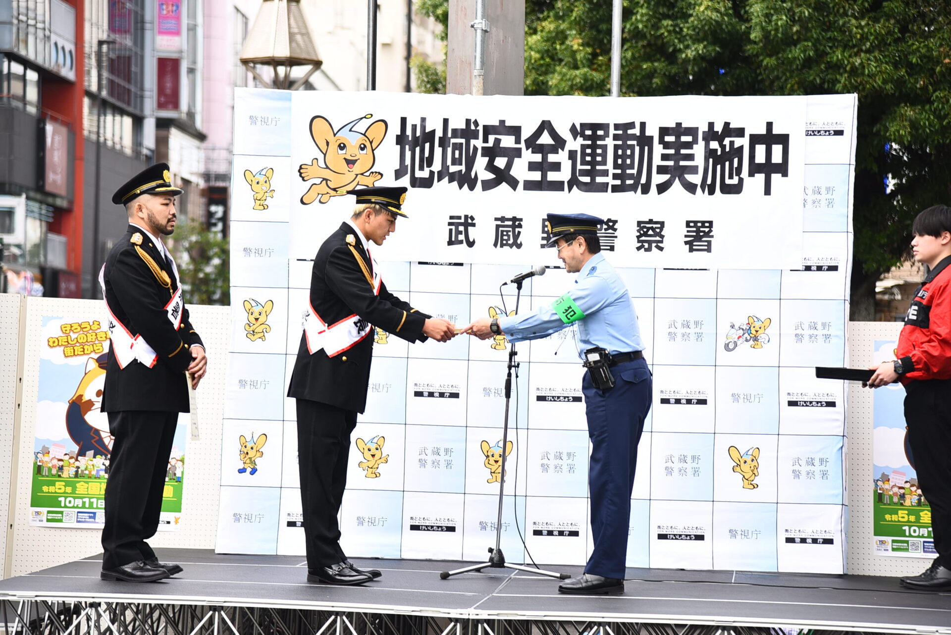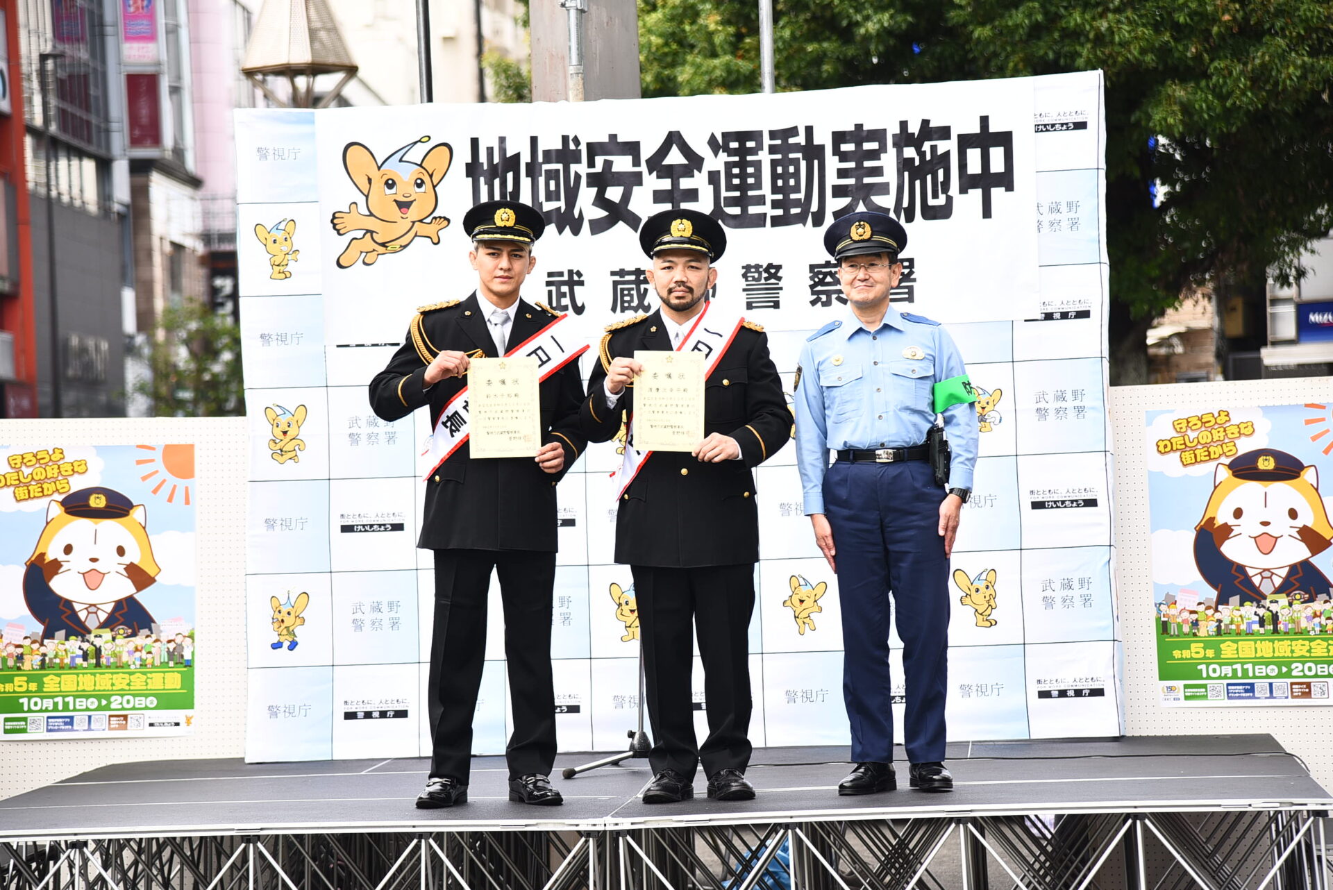 漫画「こちら葛飾区亀有公園前派出所」のキャラクター・両津勘吉と中川圭一をイメージさせる制服姿で登場した渡慶次と鈴木には、これまでの防犯活動に関する感謝状が武蔵野署の菅野修司署長から贈られた。