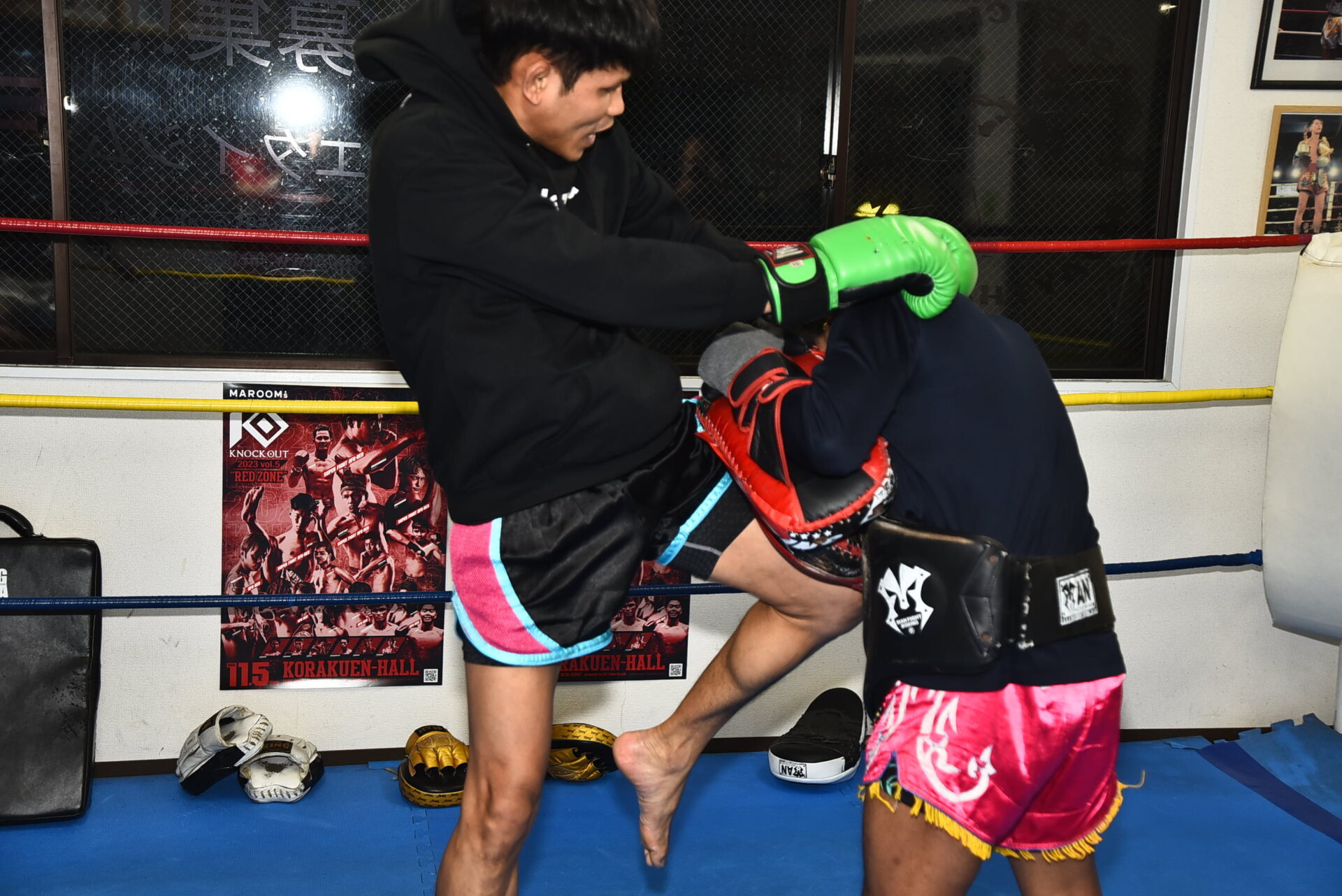 今大会は本戦全試合がオープンフィンガーグローブ(以下OFG)使用によるヒジ打ちありのREDルールで実施されることから、OFGをはめた壱がトレーナーを相手に2分1Rのミット打ちを行い、左ミドル連打とパンチをテンポよく打ち込み、ジム内に快音を響かせた。