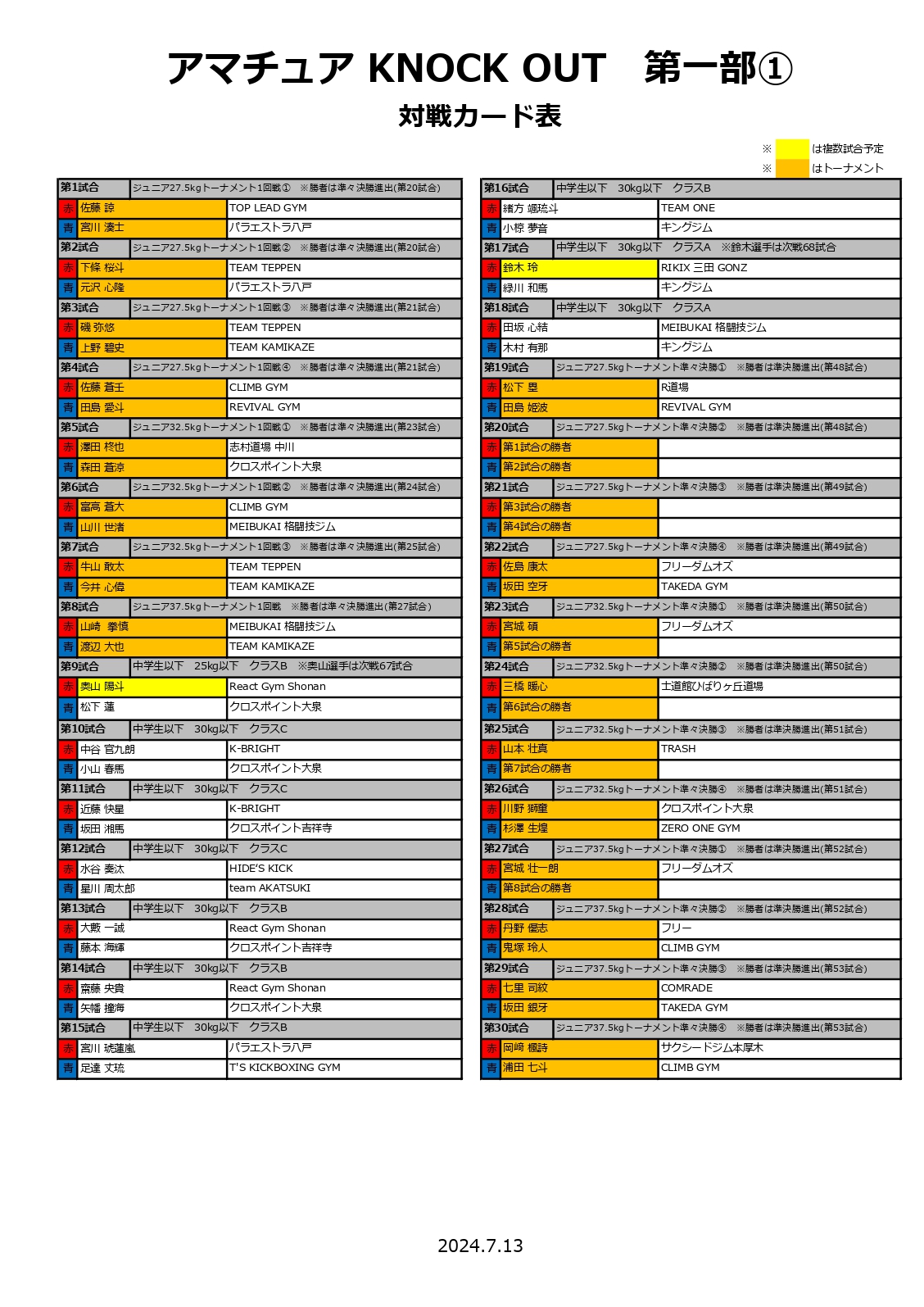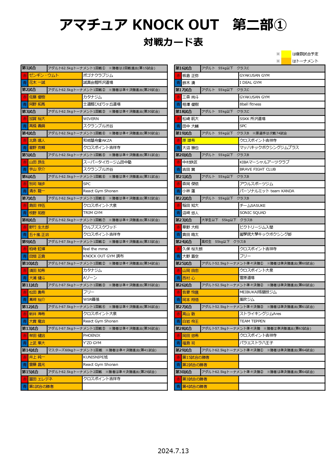 ※今大会は多数ご応募いただいた為、第一部の選手受付・計量、並びに試合開始時刻を1時間早めております。参加者の方々はご注意の程、宜しくお願いいたします。